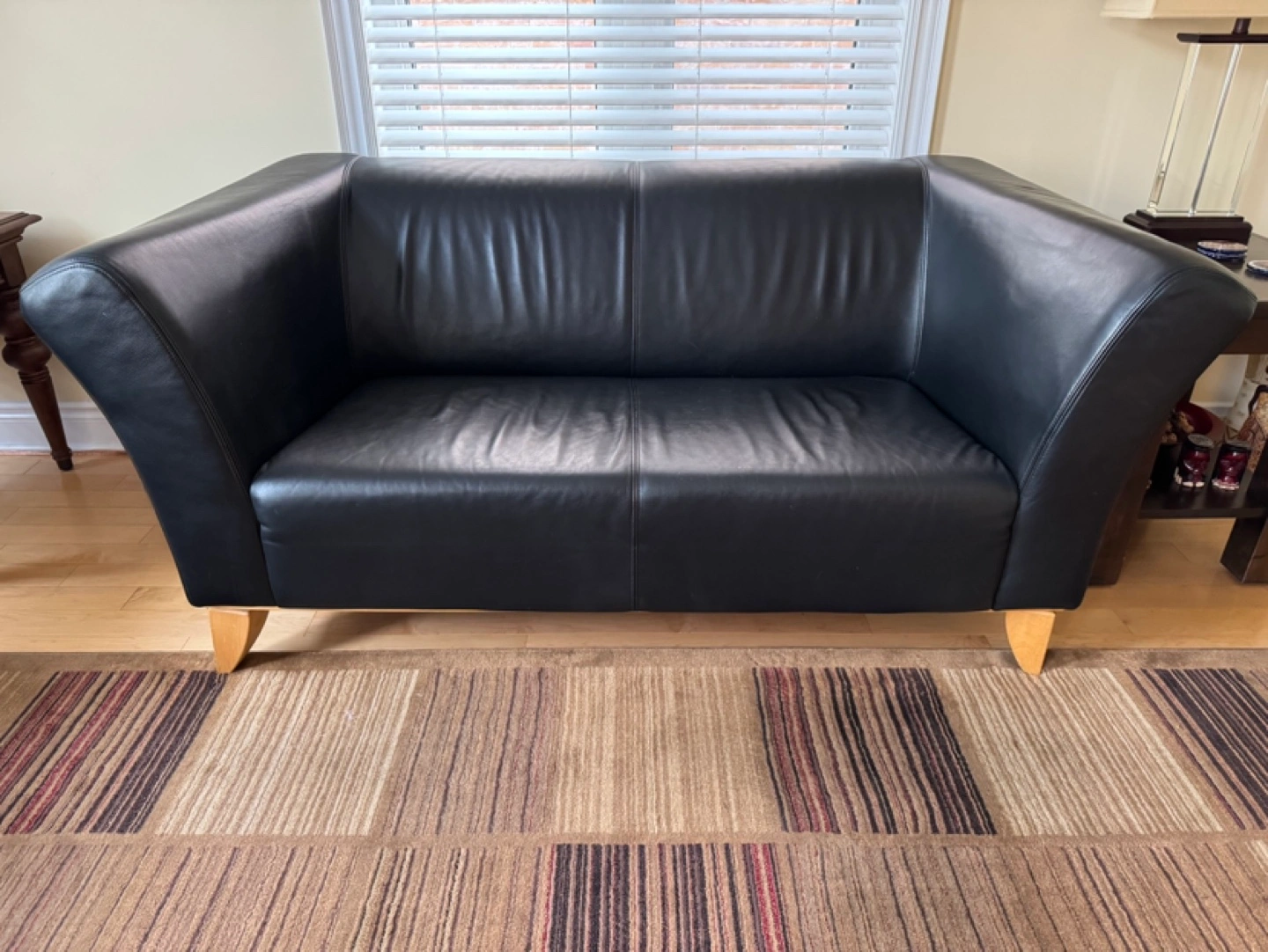 🛋️Black leather sofa with wooden legs.