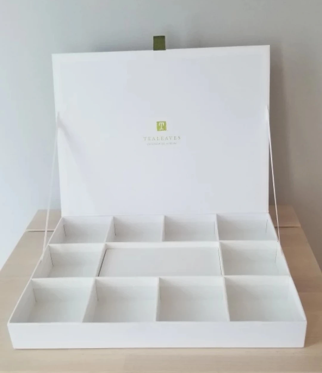 Very sturdy cardboard gift box with 10 square compartments and one shallow rectangular compartment. Magnetic closure.