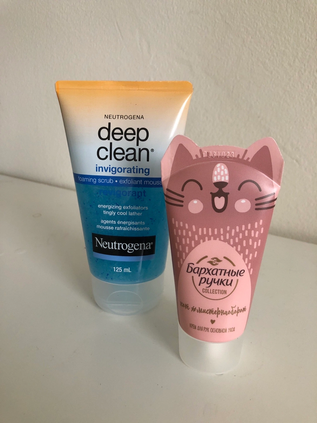 Two tubes of face and hand cream. Neutrogena Deep Clean Invigorating Foaming Scrub used 1 time so pretty much full (125 mL). Unilever Barhatnye Ruchki hand cream, never opened (45 mL)