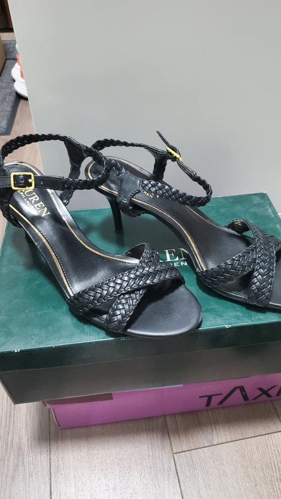 190Black leather heels with an ankle strap. The strap has a braided design and a buckle closure. The heels are a stiletto style and have a peep toe. each is fir $15, both for $25