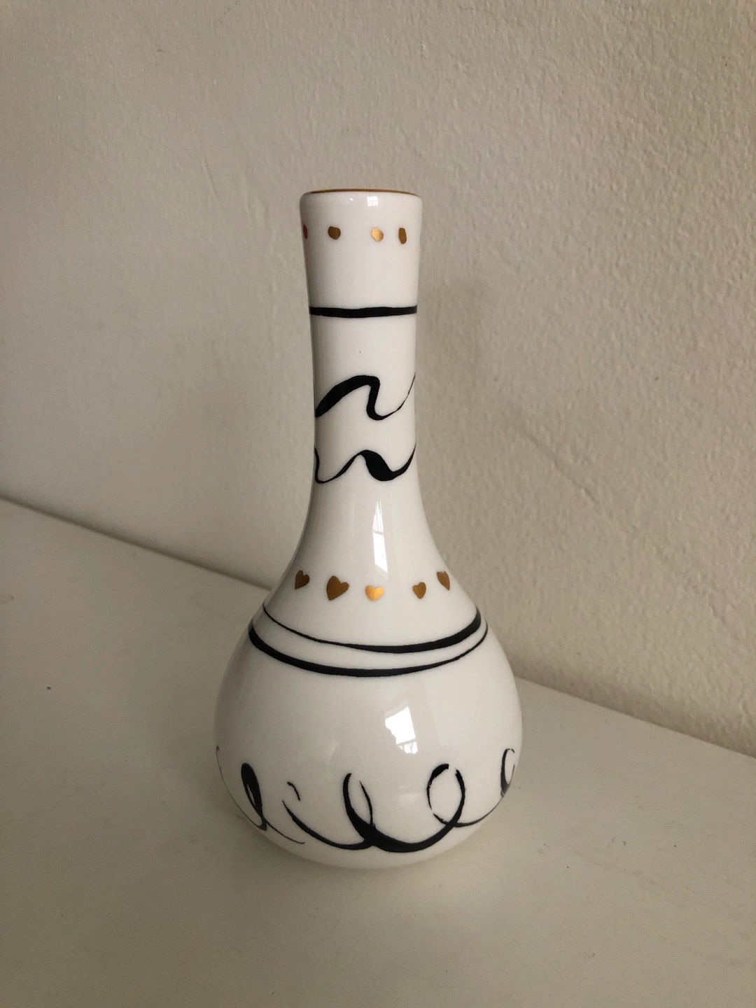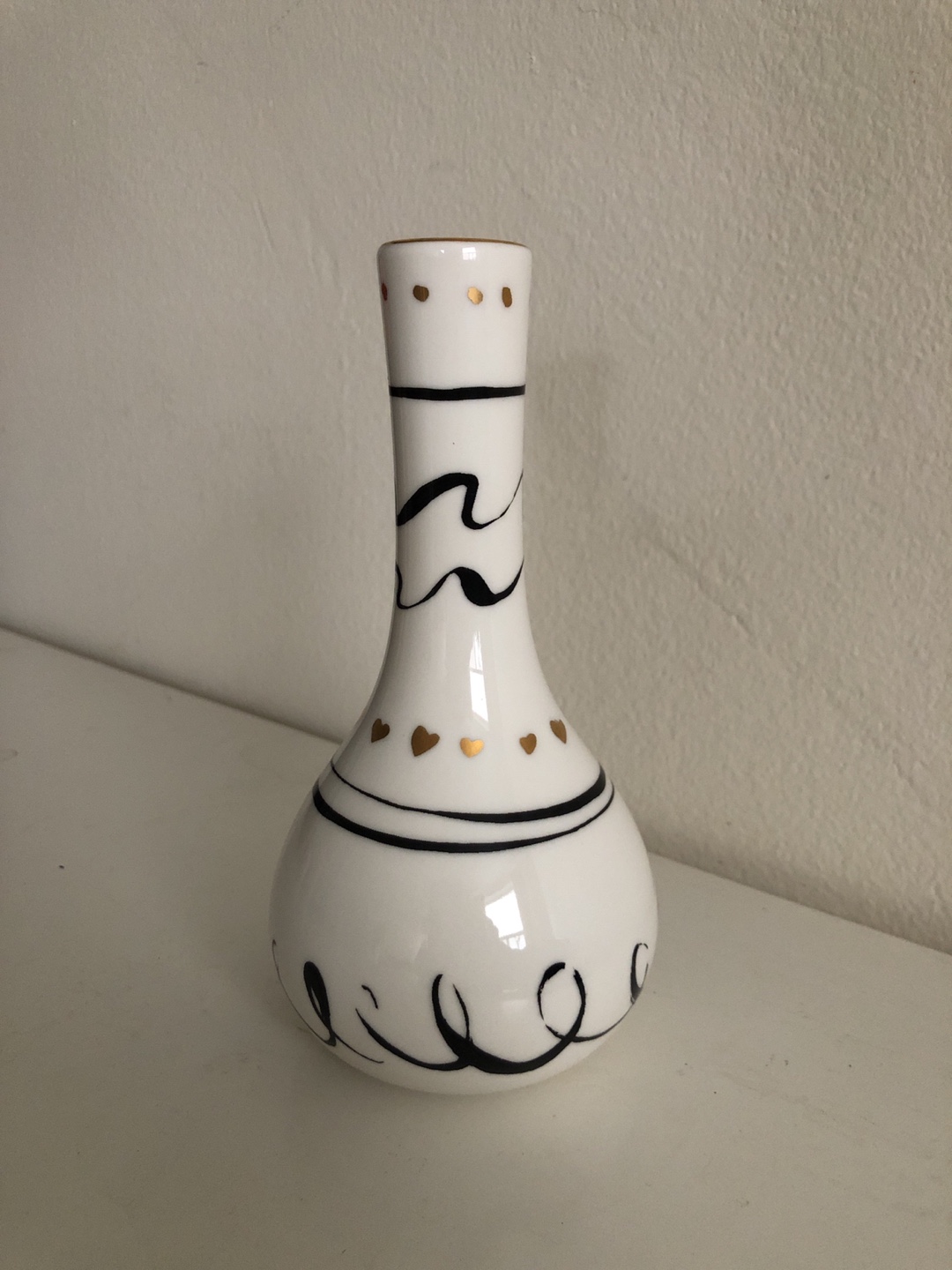 White porcelain vase with black and gold accents. Small size, perfect for a single flower or small bouquet.