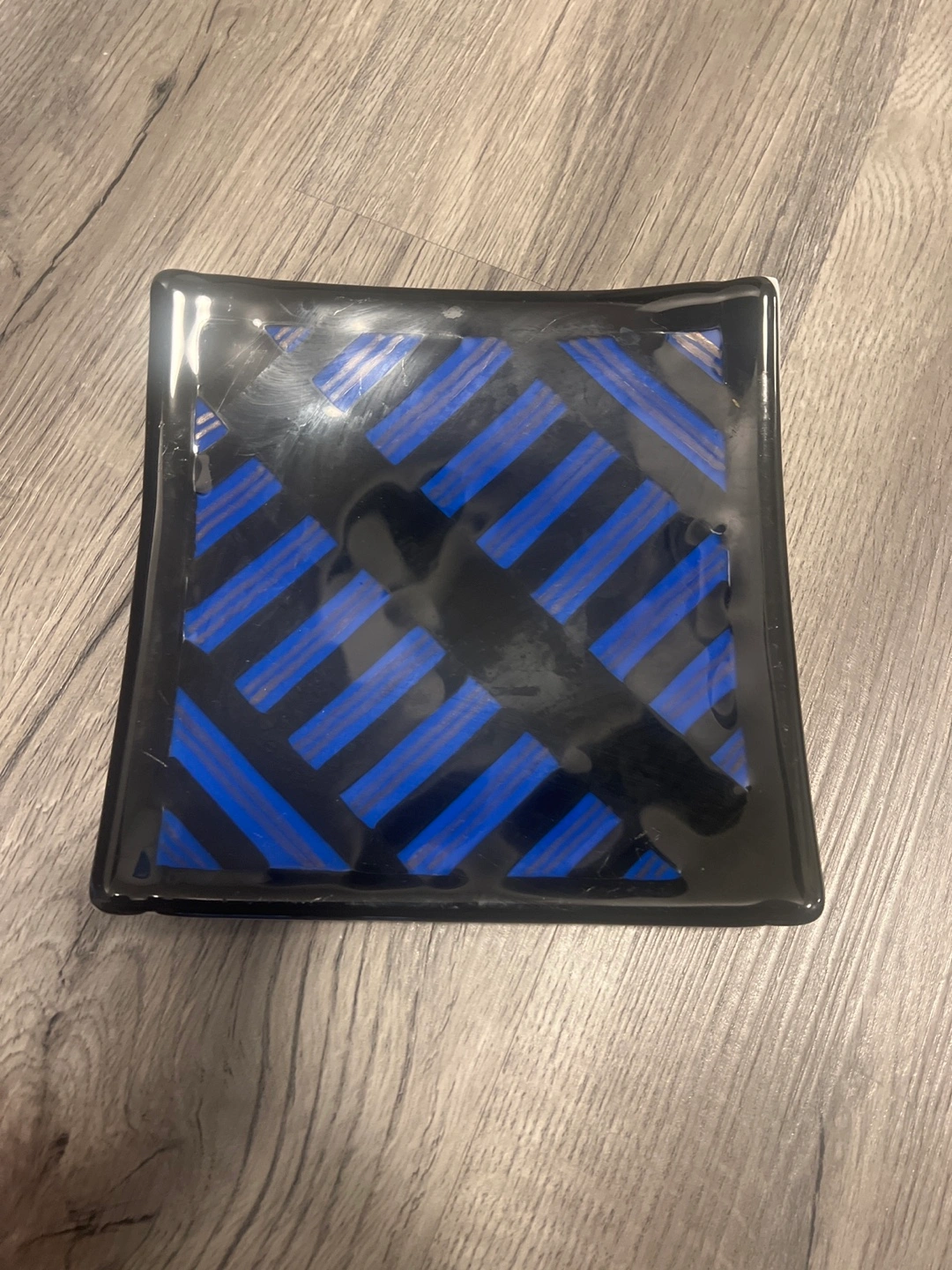Square glass serving tray with blue and black geometric pattern. Has a slight curve around the edges. Custom made