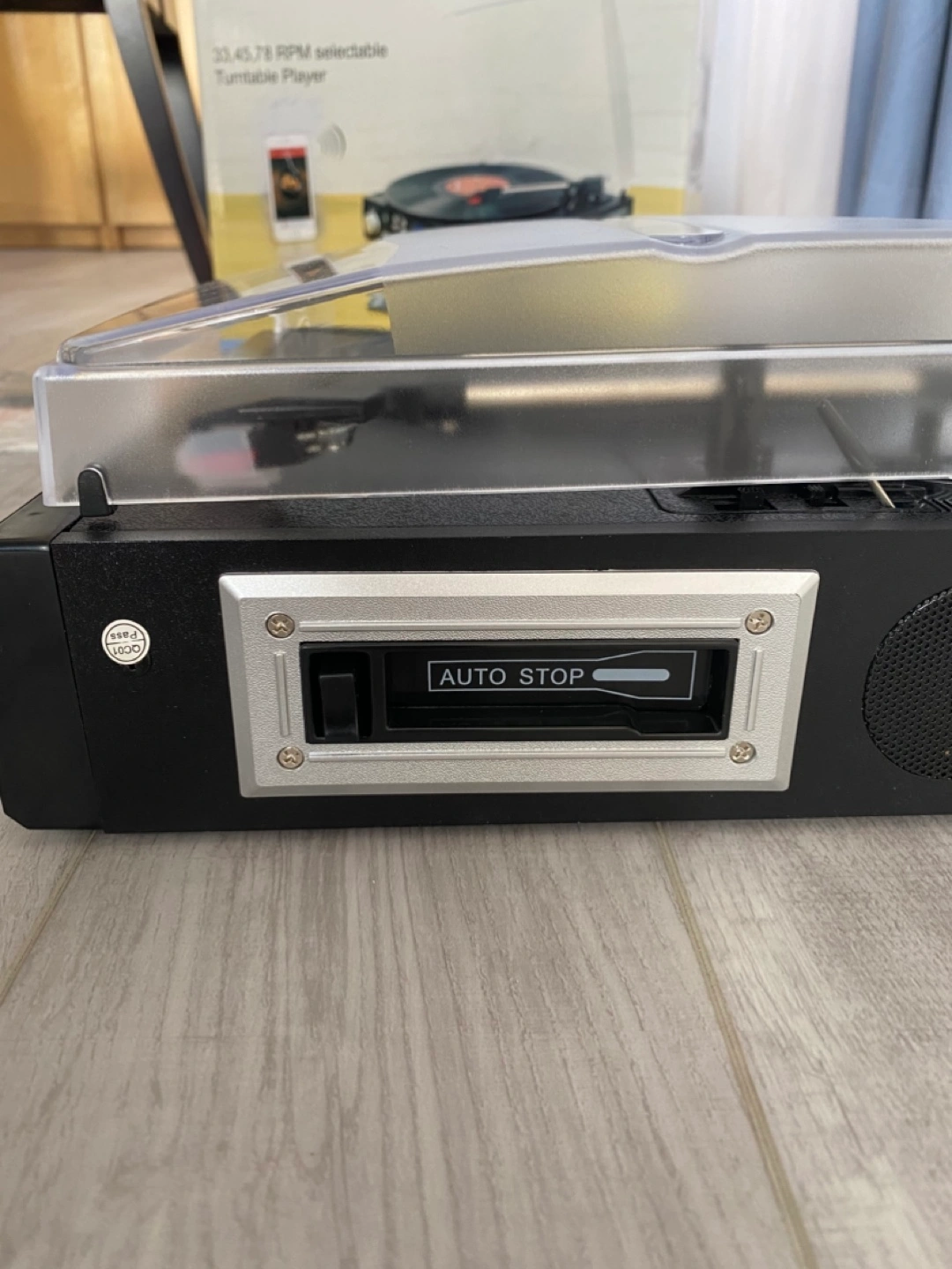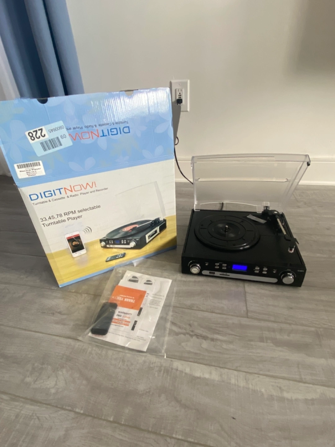 Analogue AM/FM stereo radio, LCD Screen with backlight, Earphone jack. With Dust Cover and 45RPM Adaptor.