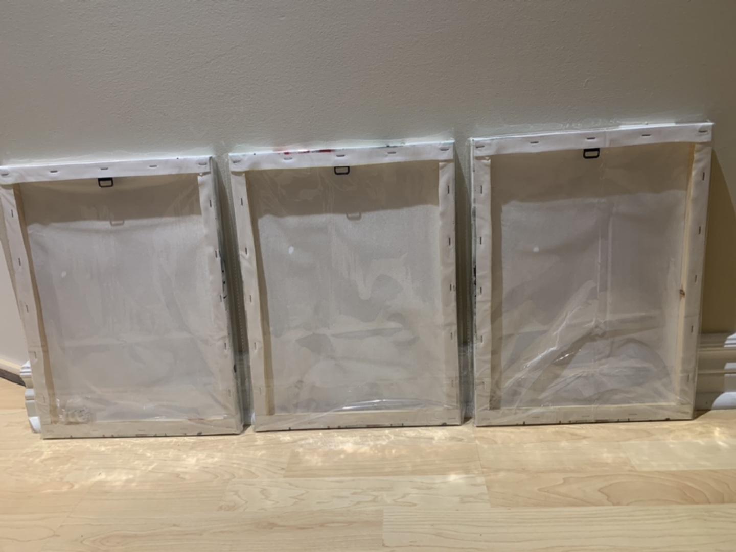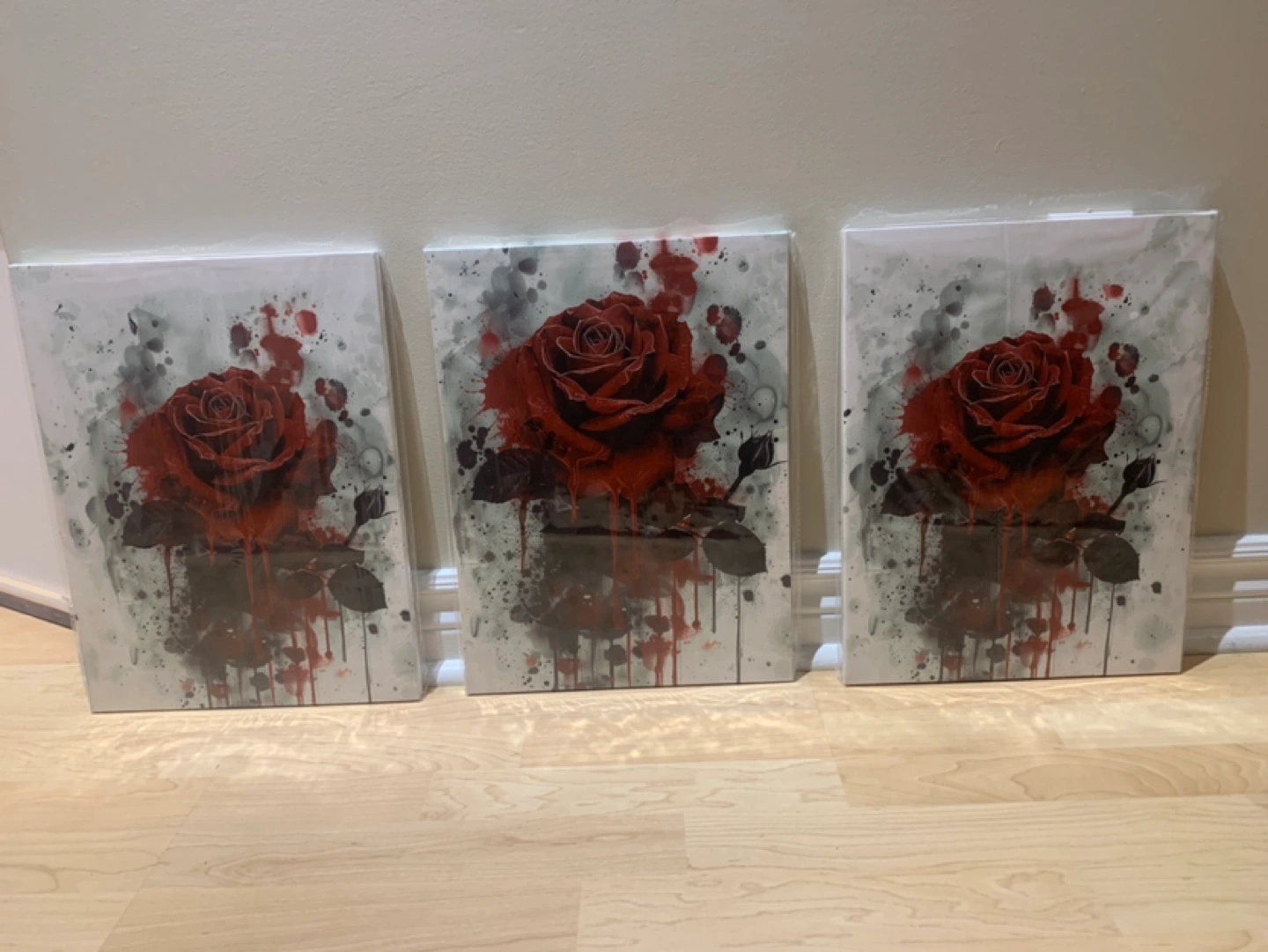 Set of 3 canvas prints featuring a red rose with water colour splatters. Each canvas measures approximately 12 x 16 inches. They are still wrapped and ready to hang.