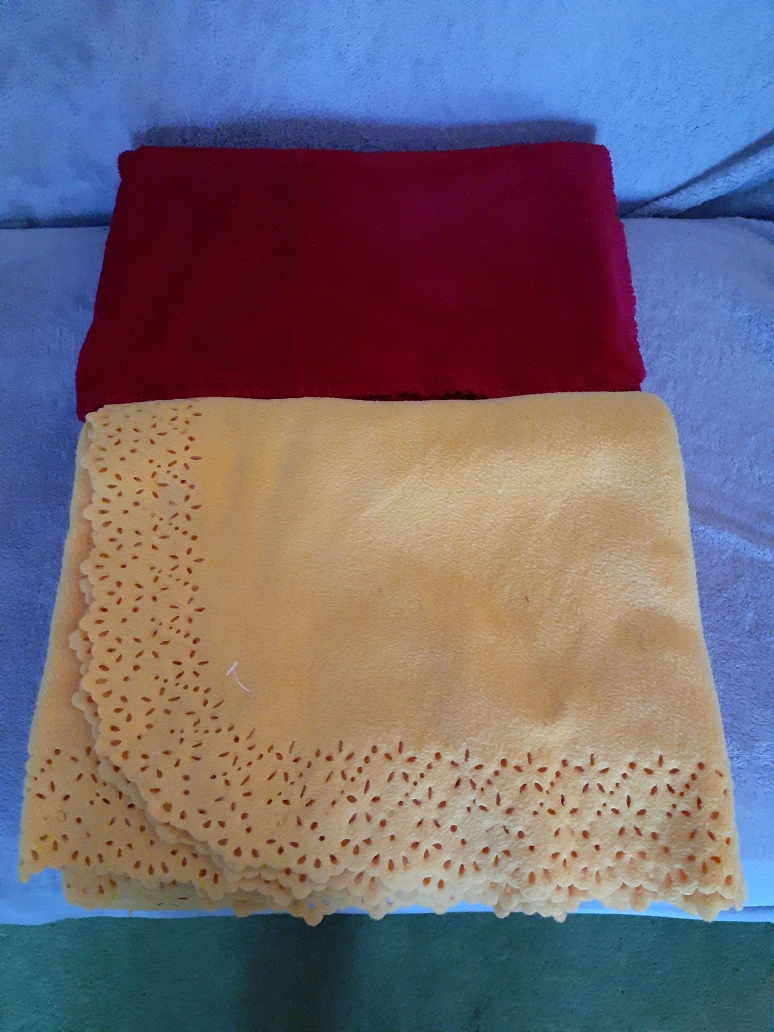 2 New Throw Blankets. One is Yellow fleece throw blanket with a decorative cut-out border and Red fleece throw blanket.