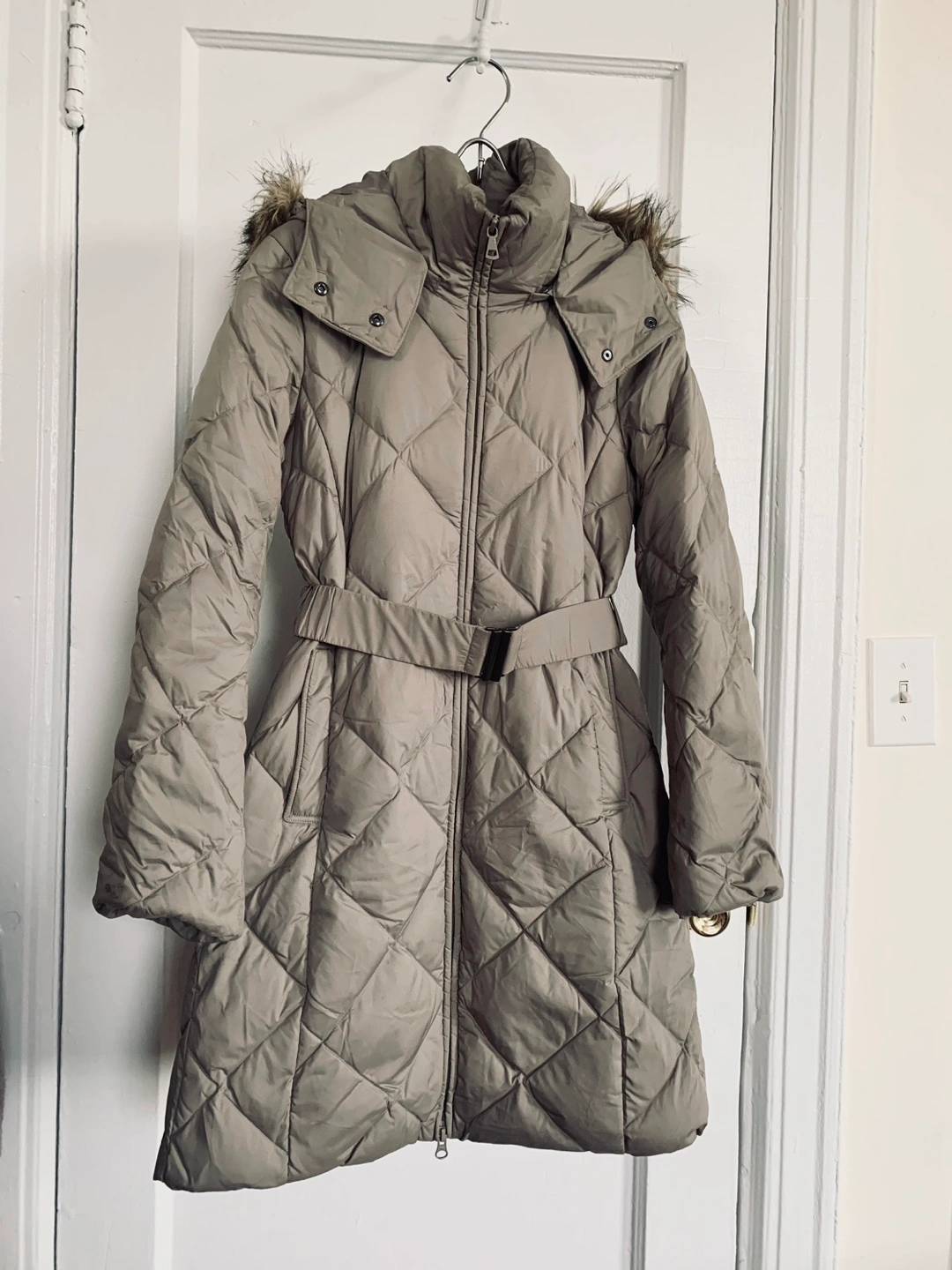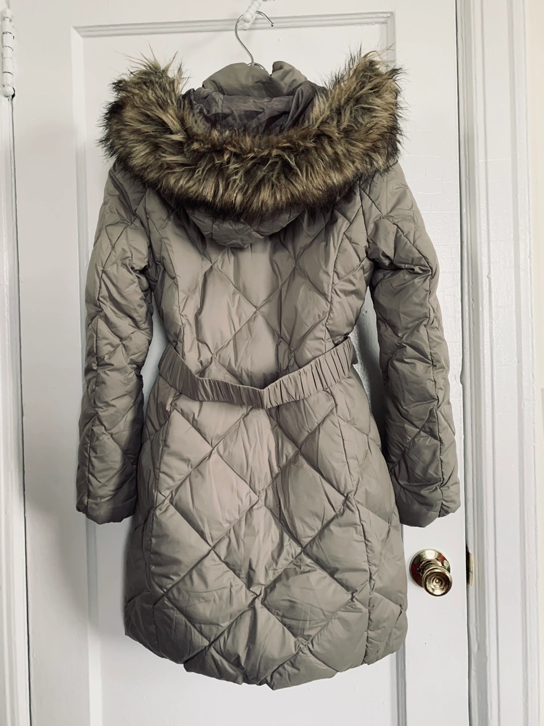 Down puffer jacket with a faux fur lined hood. Quilted design.