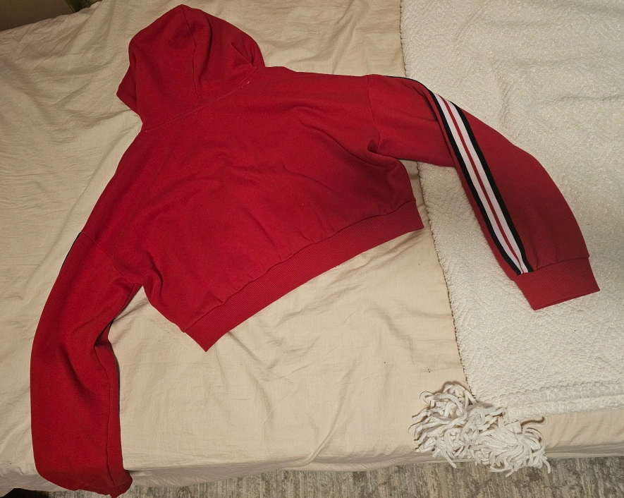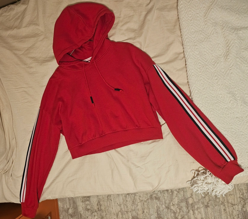 Red cropped hoodie with white and black stripes on the sleeves. Long sleeves. Drawstring hood.