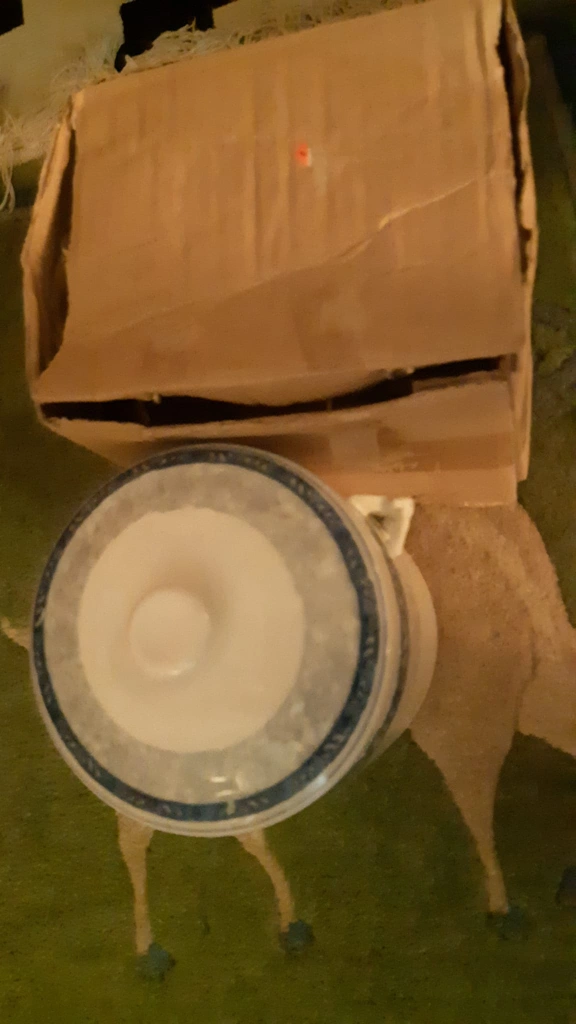 Vintage ceramic cookie jar with blue and white floral design. Features a small ceramic bird on the side. Includes lid with two handles.