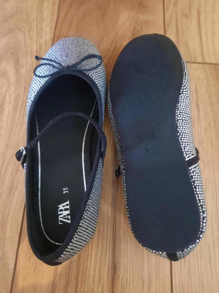 Silver sparkly flats with black trim and a bow on the toe. Size 33.