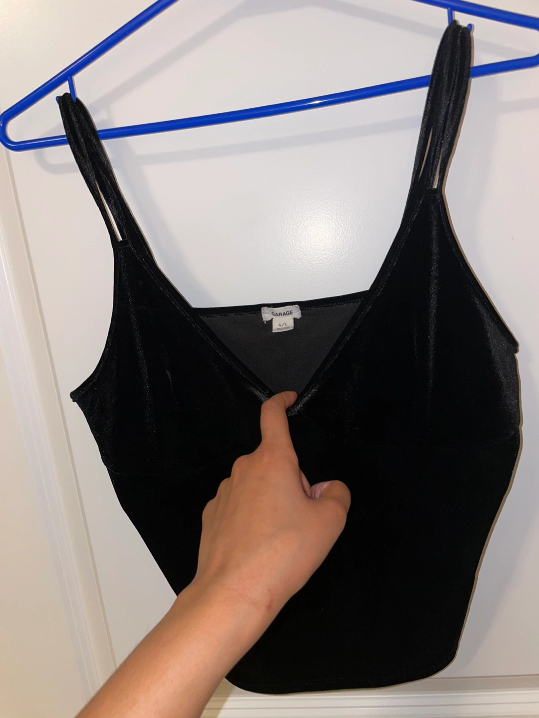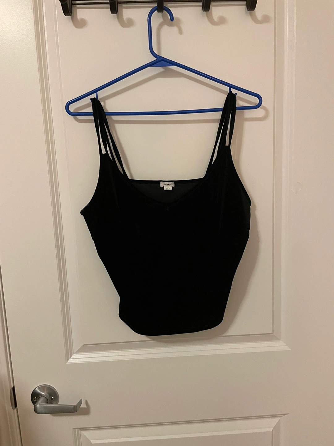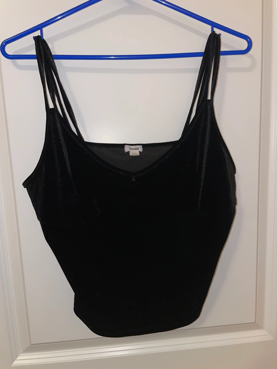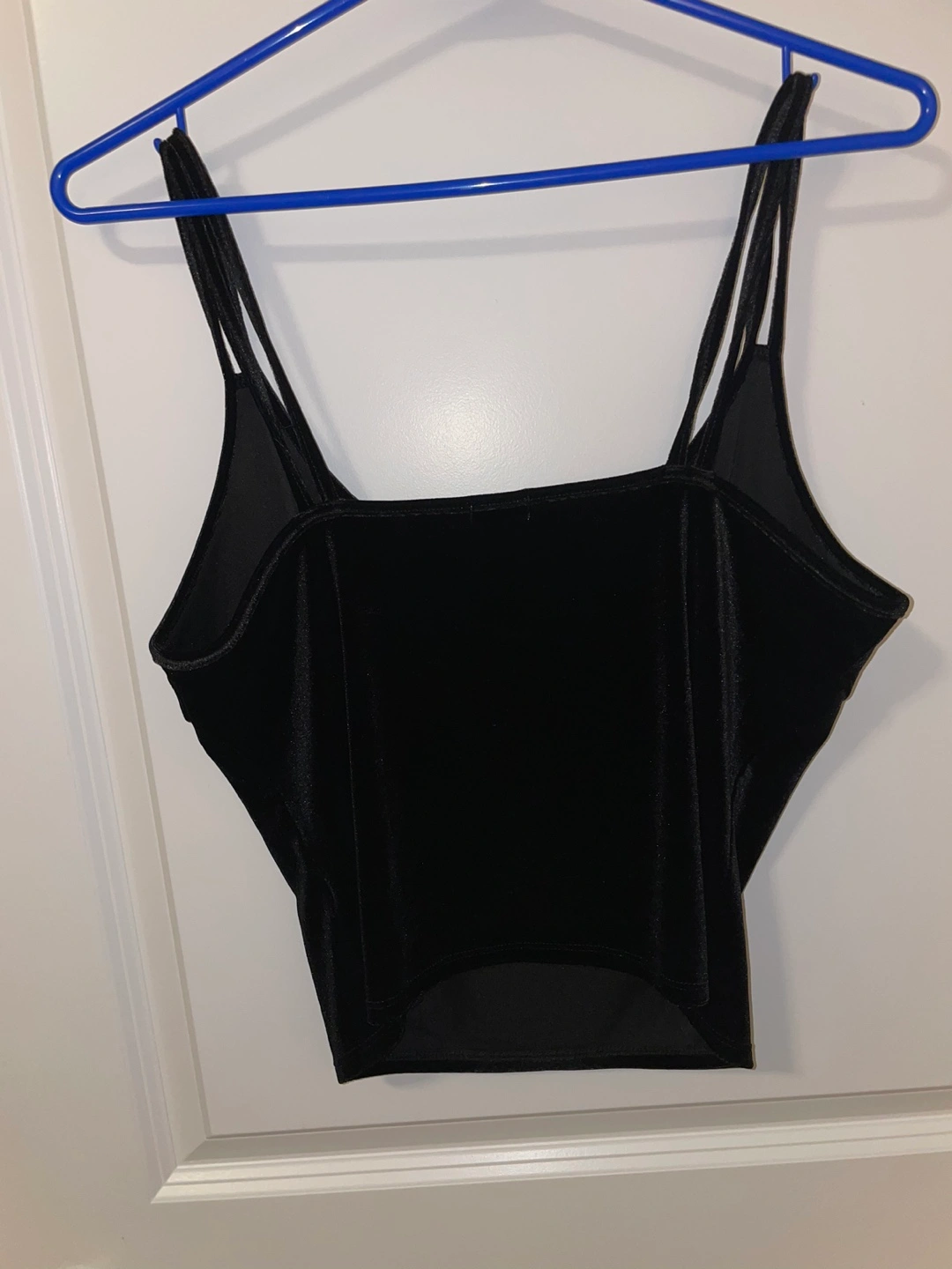 Black velvet tank top. Double strappy with a V-neck. Cropped. I’m 5’7 and normally wear Medium, and this crop top fits snug.