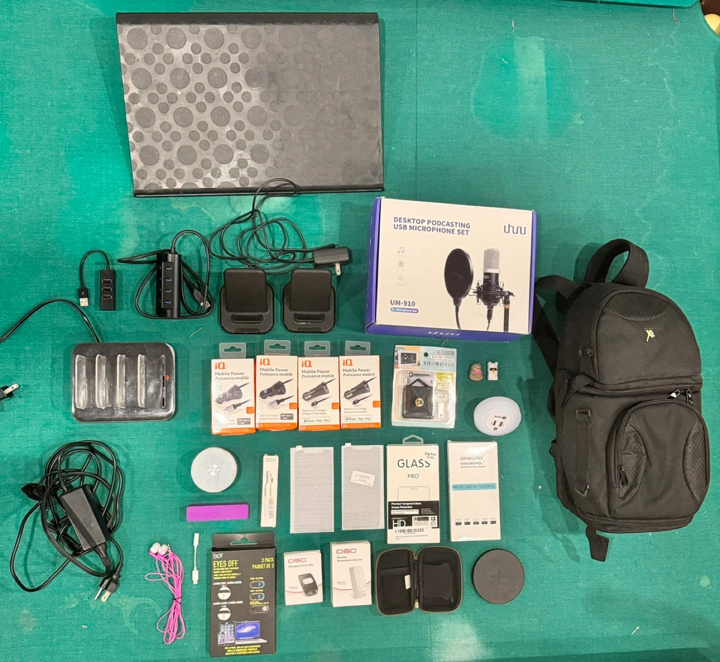 19Laptop Table - $8 USB Chargers - $15 for both Wireless Phone Chargers (1 doesn’t come with wire) - $20 each Desktop Podcasting Microphone (no USB) - $75 Large Camera Bag - $50 Laptop Charger - $20 Round Wireless Charger (no wire) - $5 Pink Bluetooth Speaker - $50 Portable Purple Charger - $5 Pink Wired Headphones - $5 Wired Headphone Case - $5 3 Packs Camera Covers - $15 Airpod/Headphone Cleaner Tool - $15 Iphone Headphone Adapter - $10 Charging Station with Dividers - $20 Rapid in Car Chargers (2 are USB Type C, 2 are for Apple products) - $15 each Sloth and Llama Cable Covers - $15 Wireless Panic Key - $15 Wireless Temperature Detector - $15*SOLD* Screen Protectors for Phones - $15 each Clock Kit - $15 2 Usb Charger/Night Light - $12*SOLD*