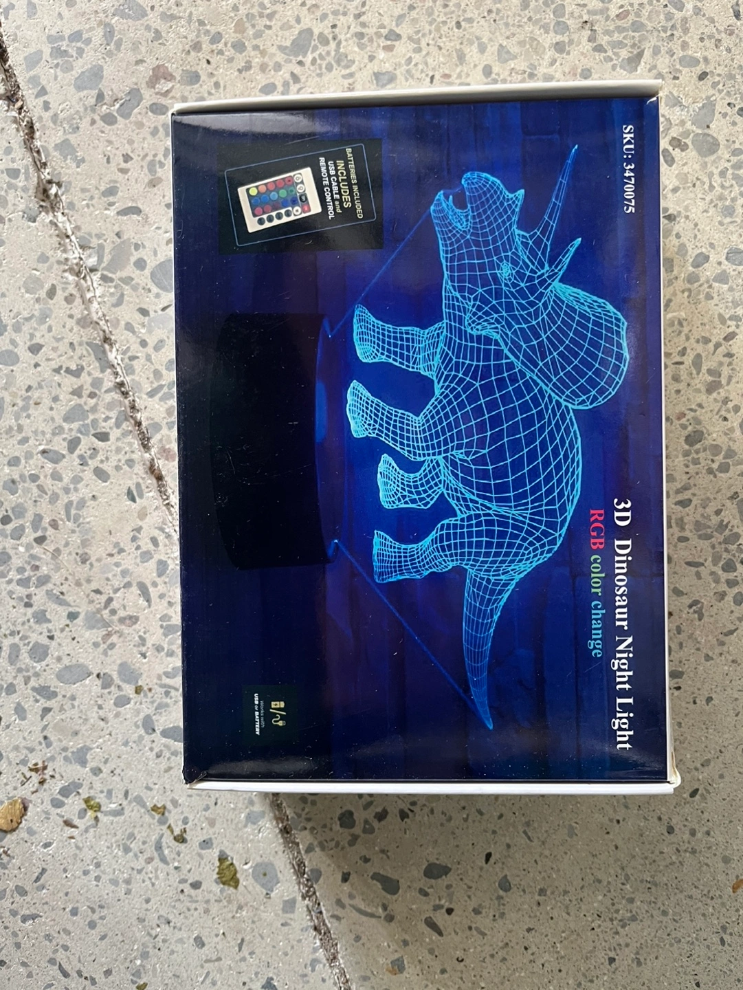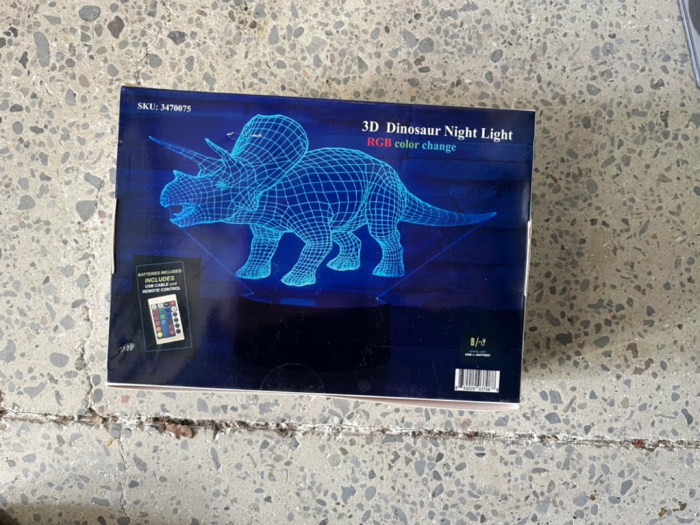 π Christmas Sale - Limited Time Offer!π 3D Dinosaur Night Light RGB color change Pick up by appointment only at 4590 Dufferin st, or 175 Hilda Avenue. Call/text : 647-988-1324 or message here Only one available, no holds without payment. --- π Product Details: Cool 3D Dinosaur Night Light RGB color change comes with remote and USB cable, works on batteries and plug Free usb plug will be included - Original Price: $29.99 + HST - Sale Price: $10 NO TAX. - Condition: Brand new π Donβt miss out on this festive deal! Grab yours before itβs gone!