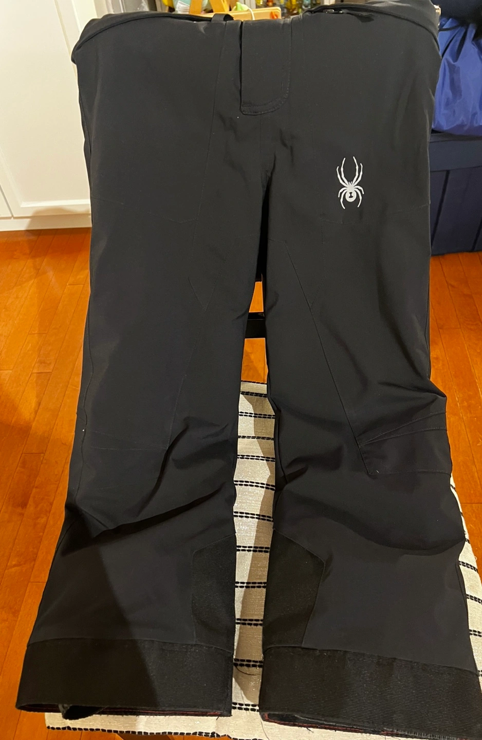 Black ski bibs with adjustable straps. Features zippered pockets on the front and back and grow leg technology to extend the length of the legs 2 inches. Pick up only.