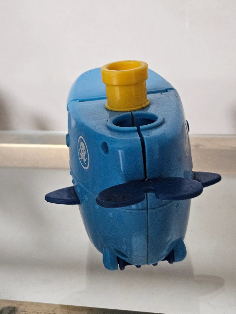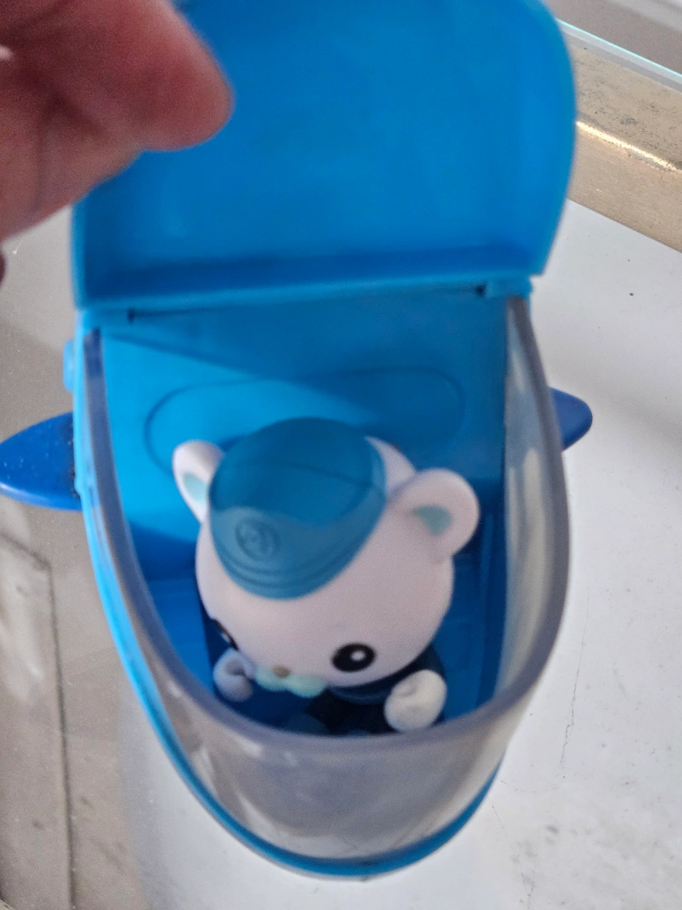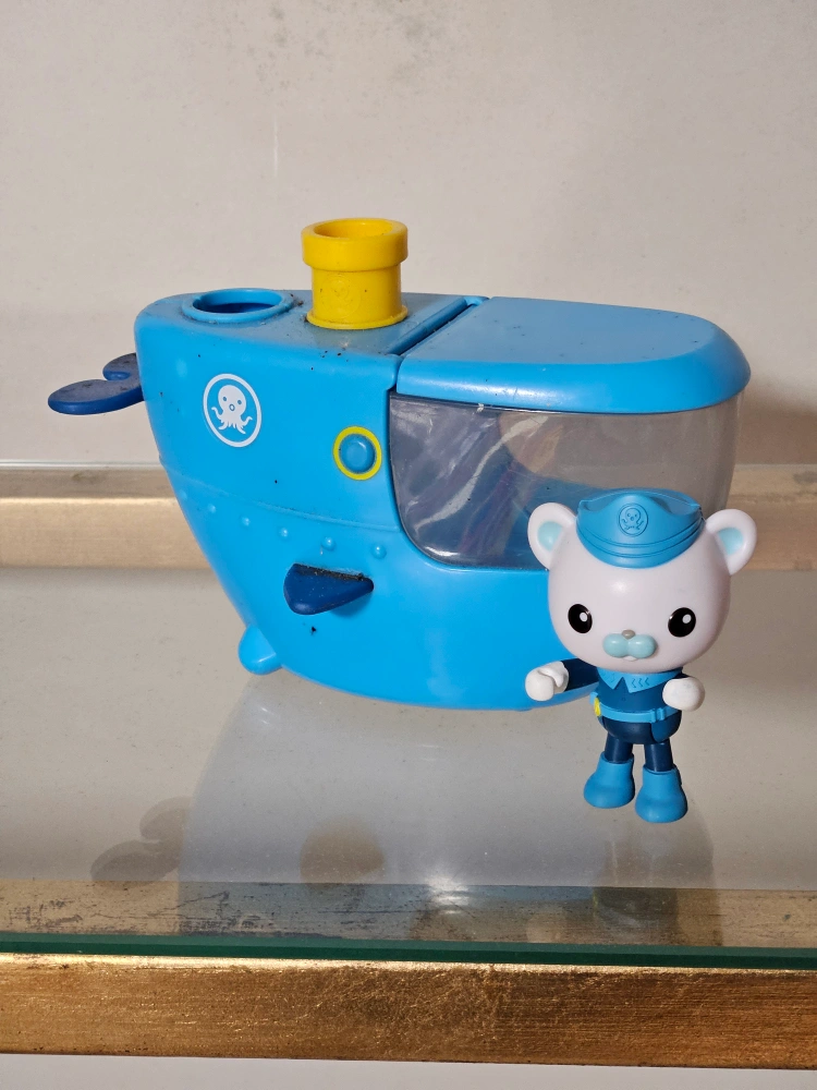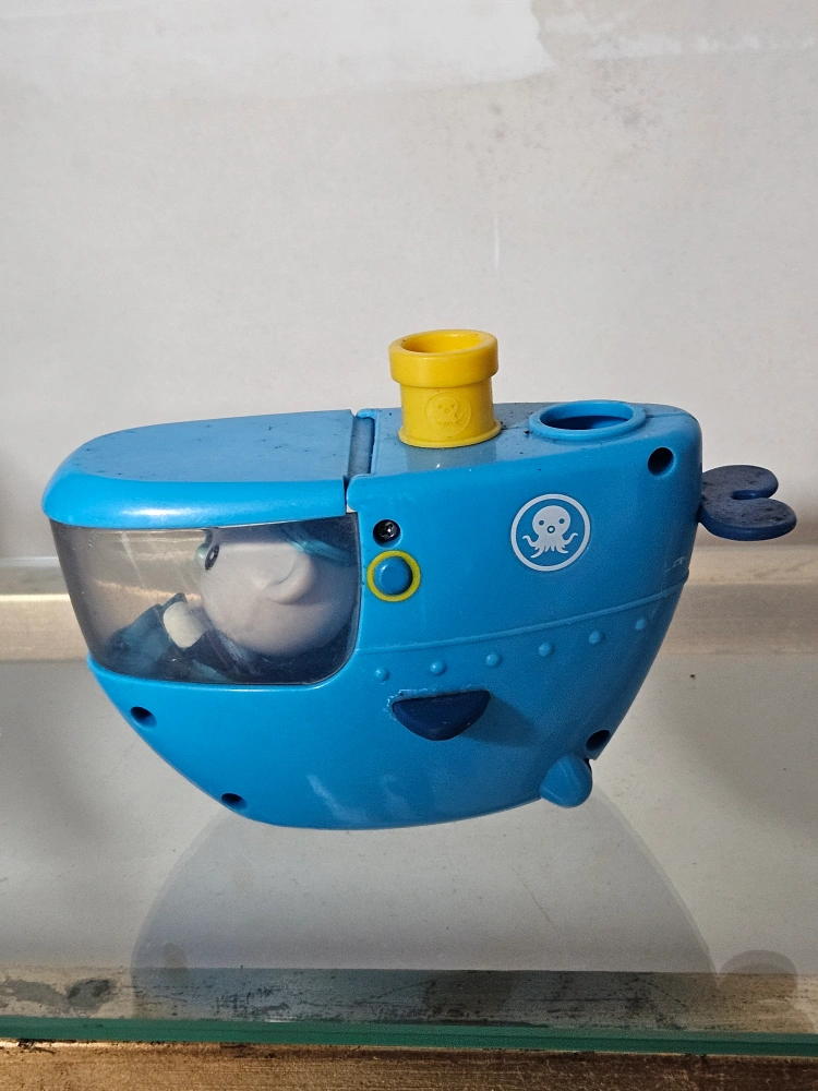 36Submarine with a figure of Kwazii the polar bear. Has a clear plastic window that opens and closes, and wheels on the bottom. The periscope spins.