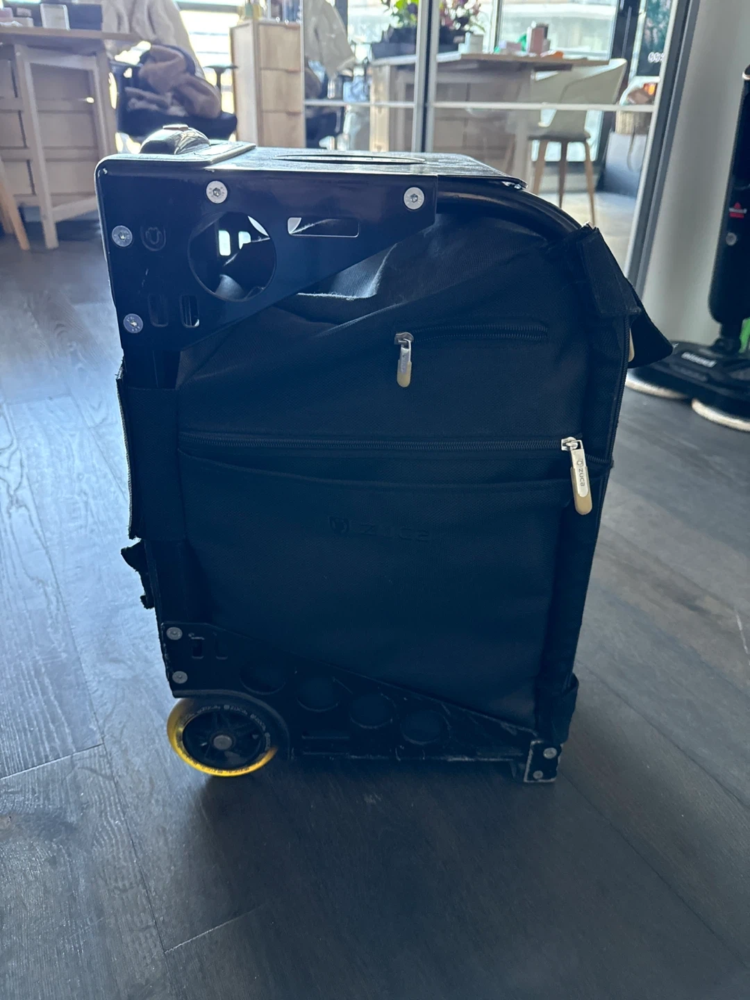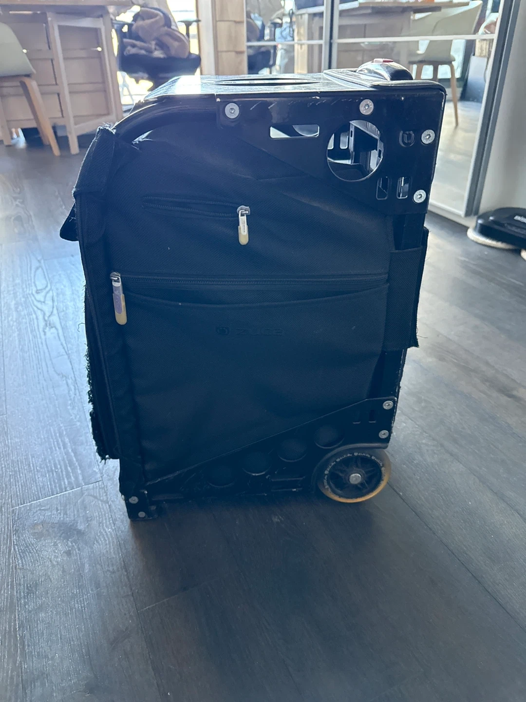 Make Up For Ever Professional rolling makeup case in black. It's designed for organizing and transporting professional makeup. Durable construction with wheels for easy mobility. Front has a rip but can be fixed or you can buy a new bag for the frame online. Everything still works perfectly and nothing will fall out.