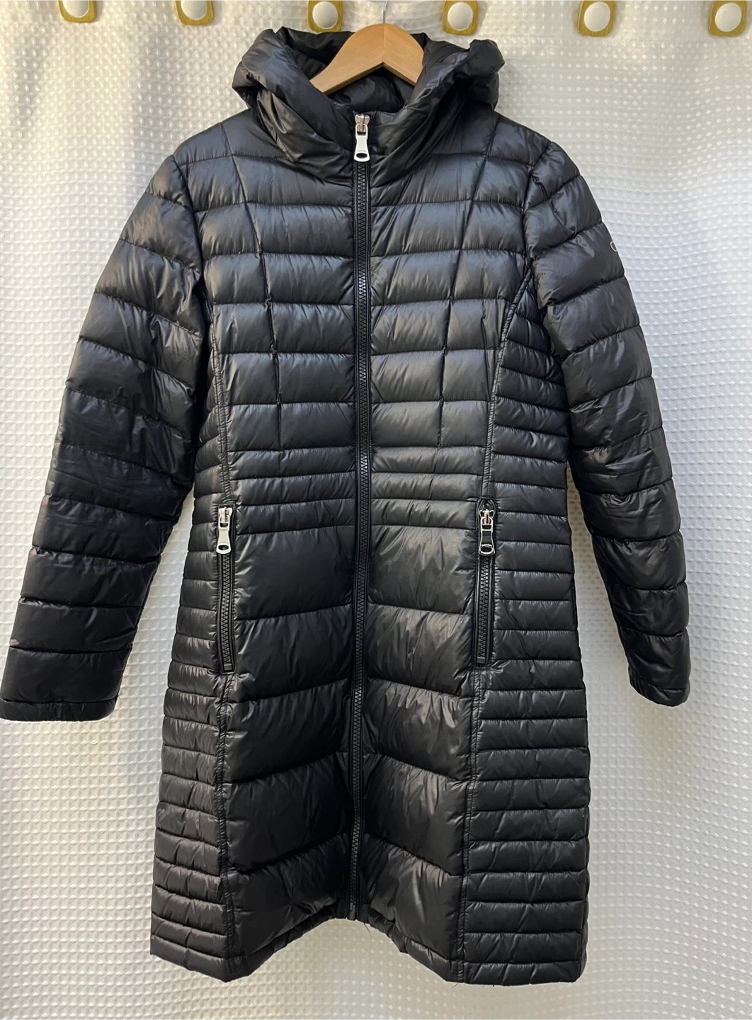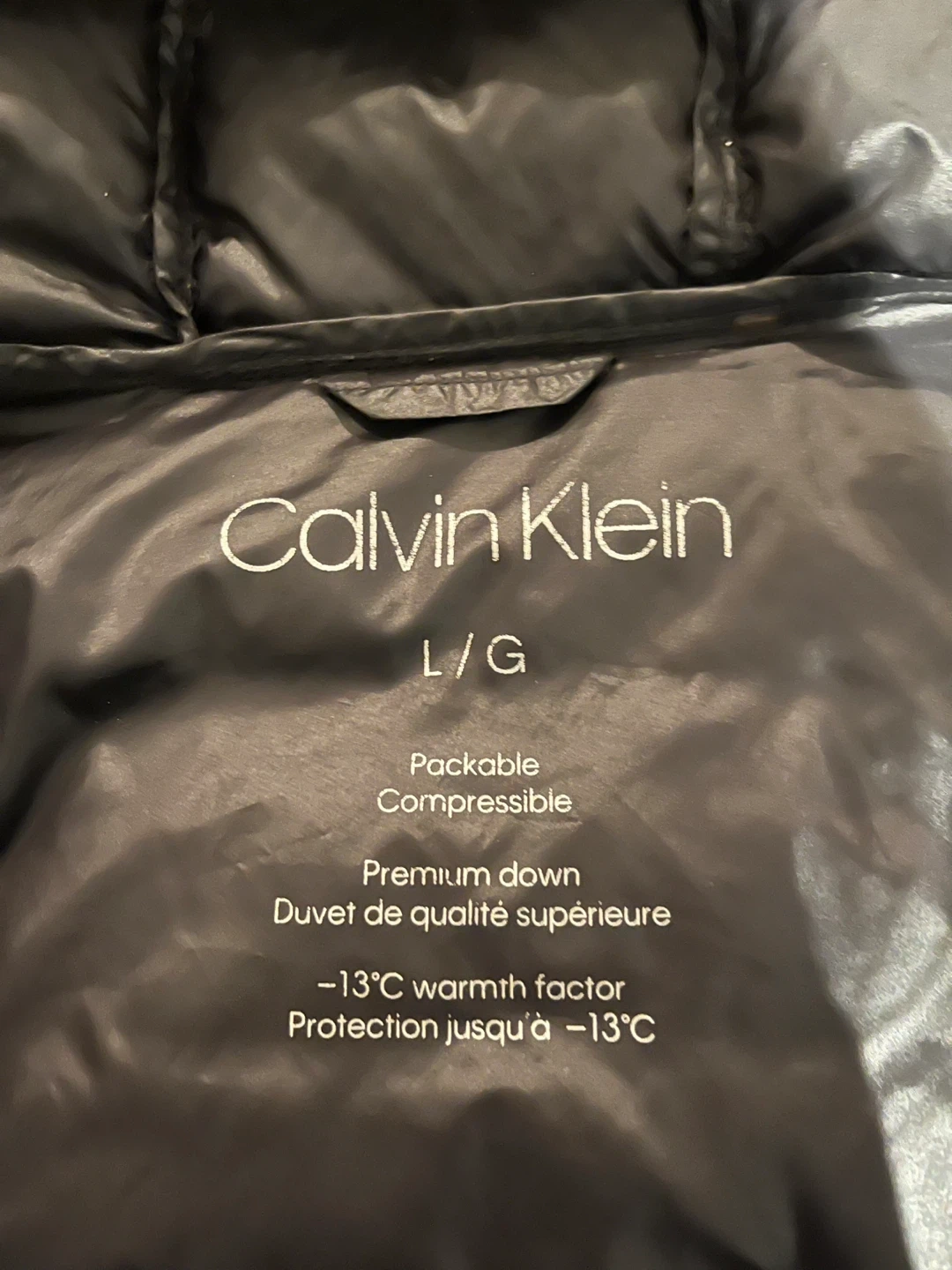 Calvin Klein packable puffer coat in black. Features premium down fill for superior warmth. Protects down to -13°C. It's a lightweight and compressible outerwear piece. Size L and in great condition!