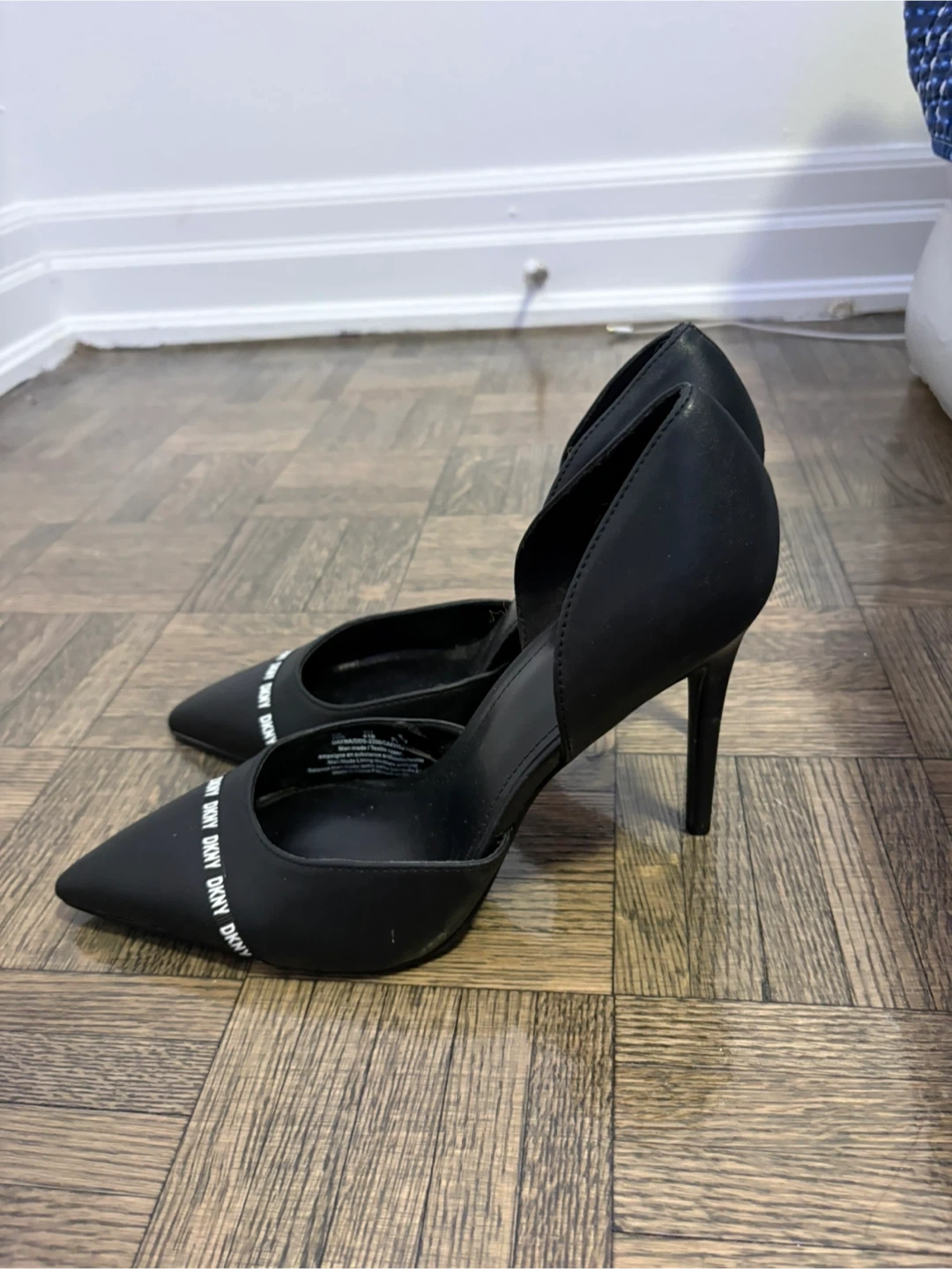 Stylish DKNY black pumps, size 10. These heels feature a classic pointed toe with the brand's logo tape detail around the vamp. They're a versatile choice for dressing up or down.