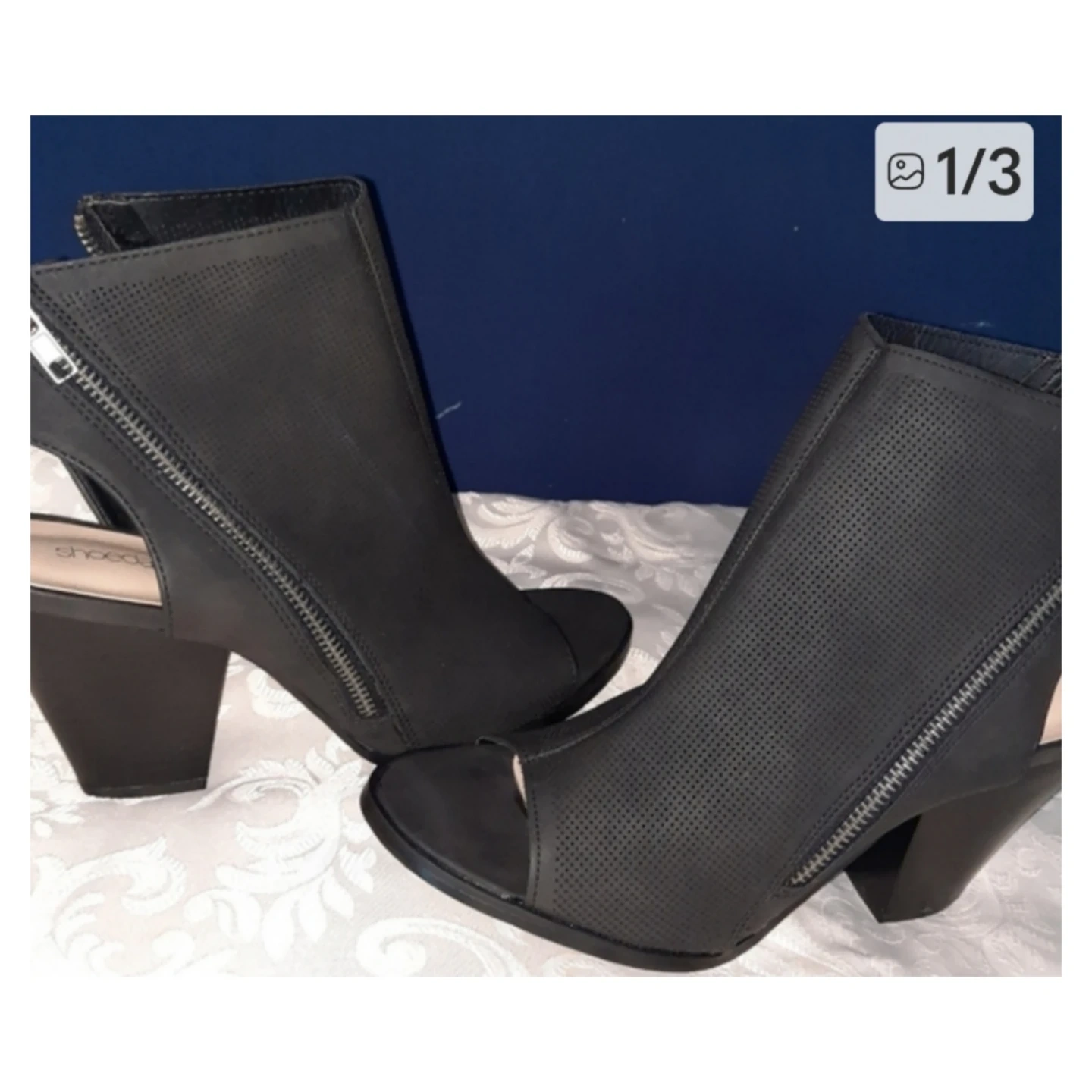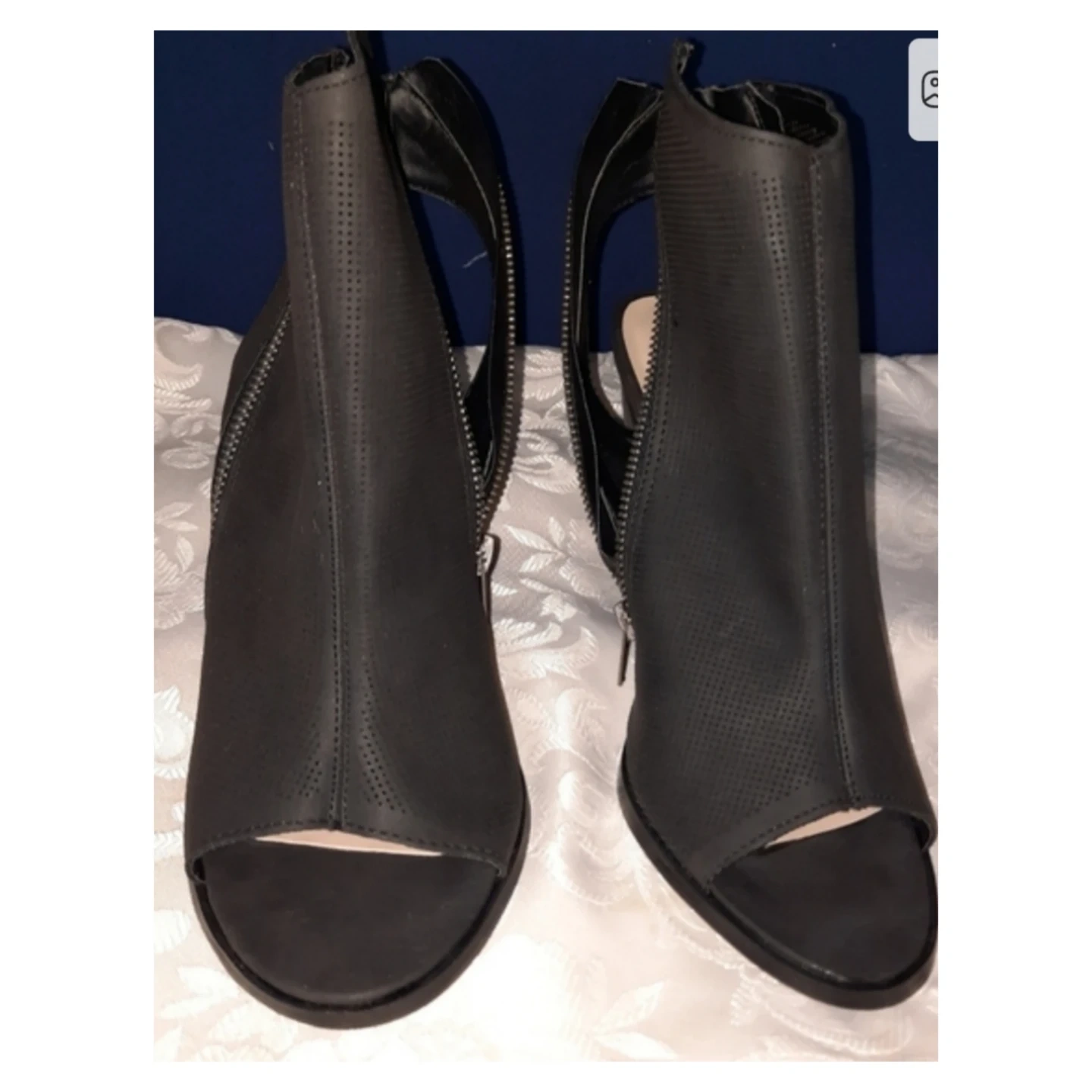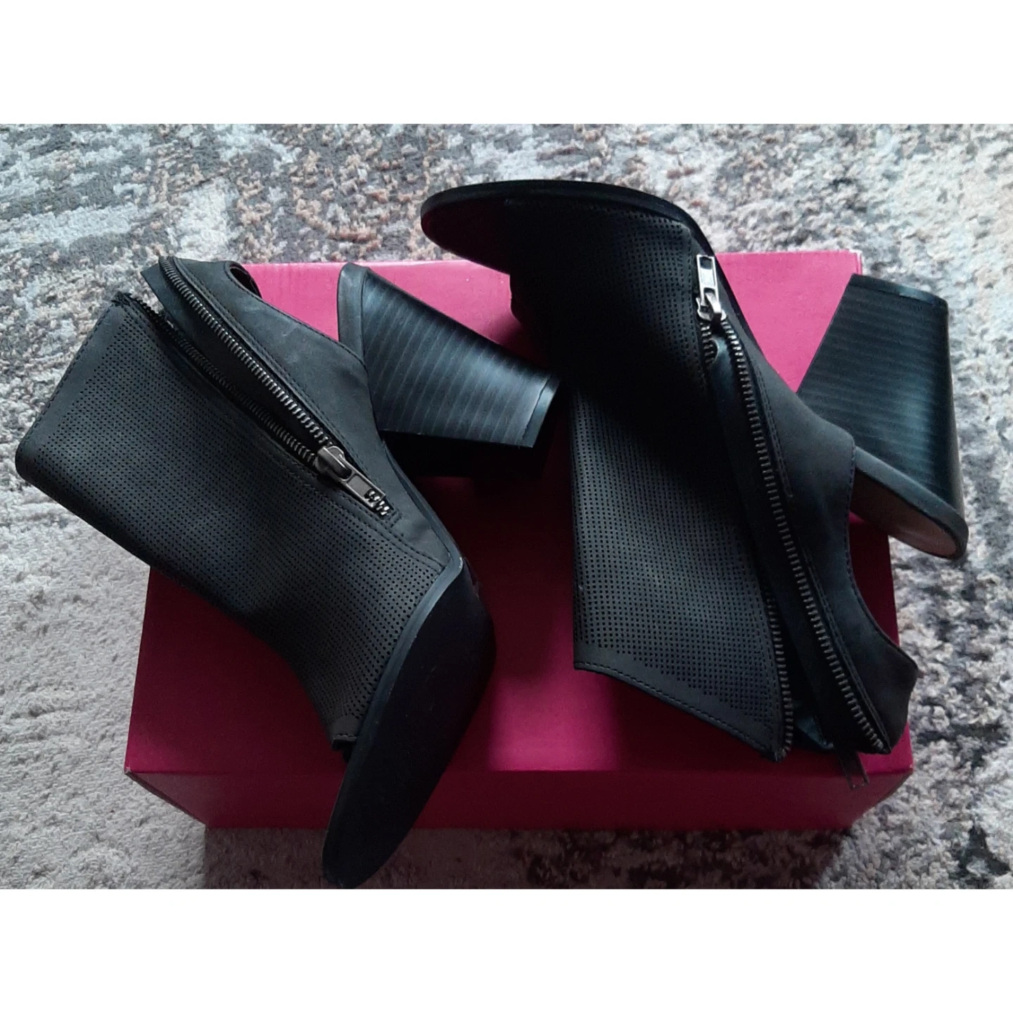 Black perforated peep-toe booties by ShoeDazzle. Features a side zipper and a chunky heel. These stylish booties are made of faux leather. They're great for adding a bit of edge to any outfit!