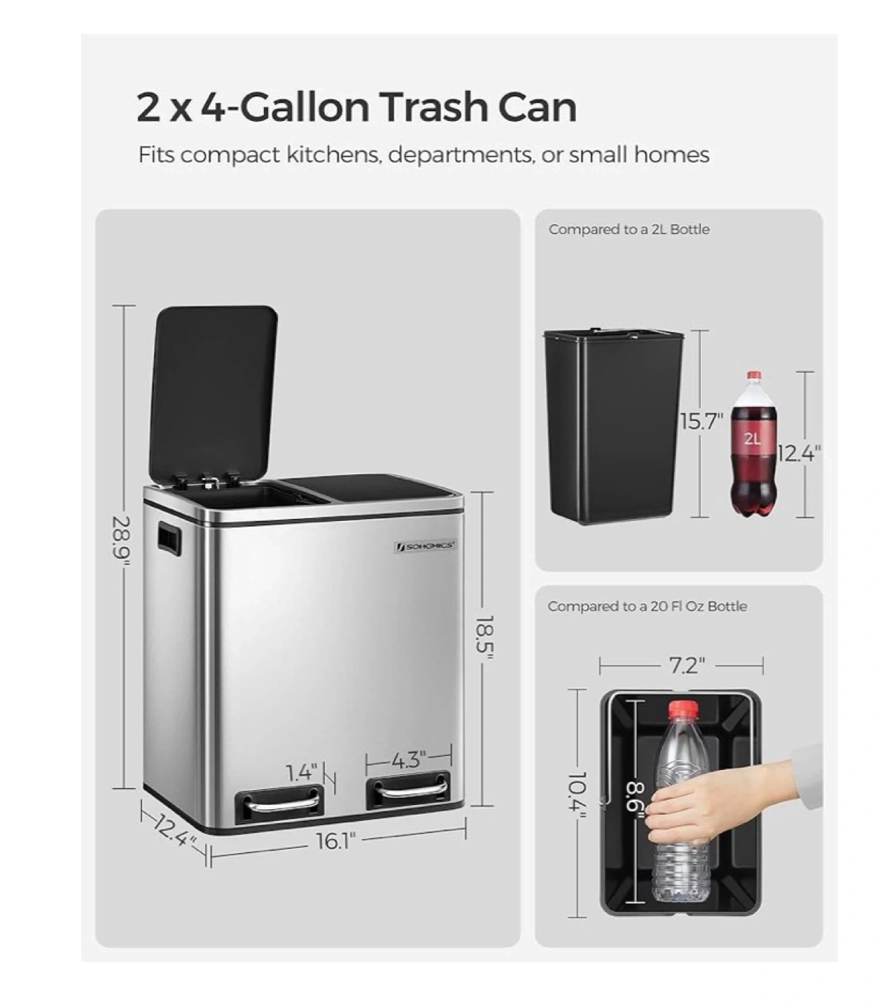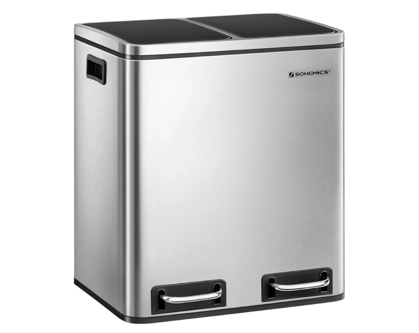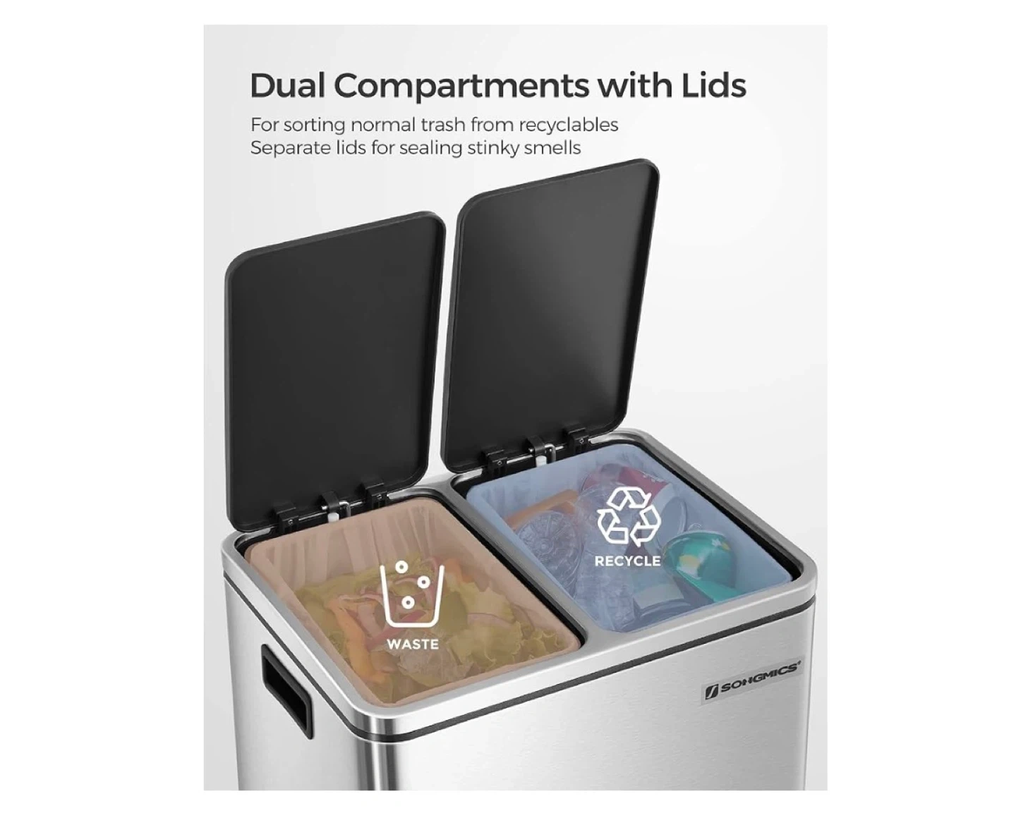 This is a SONGMICS dual trash can with two 4-gallon compartments. It's made of stainless steel and features separate lids for sorting waste and recyclables. This can fits compact kitchens or small homes.