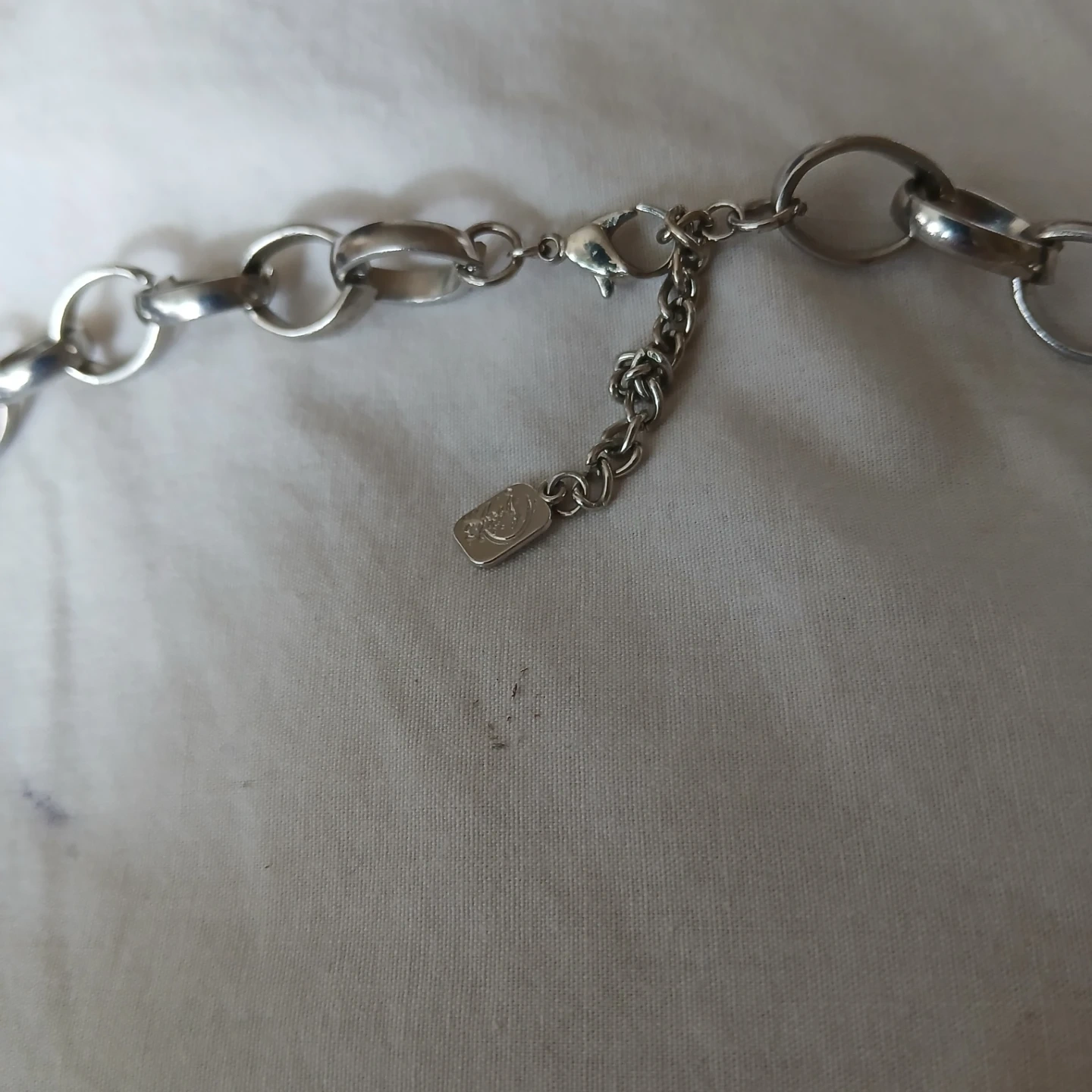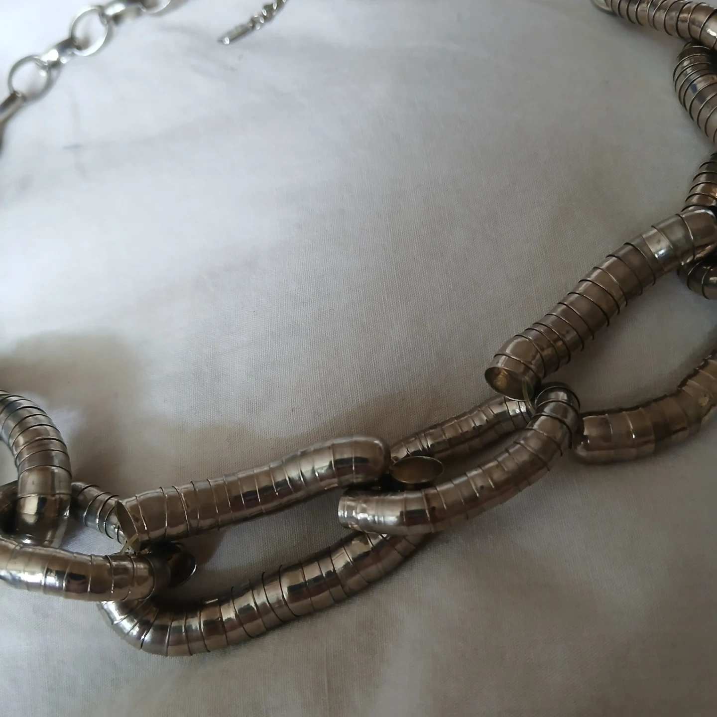 A striking silver-tone statement necklace with a chunky chain design. It features a unique combination of oval and cylindrical links, creating a bold look. The necklace has an adjustable clasp for a custom fit. This piece adds instant drama to any outfit!You and I brand