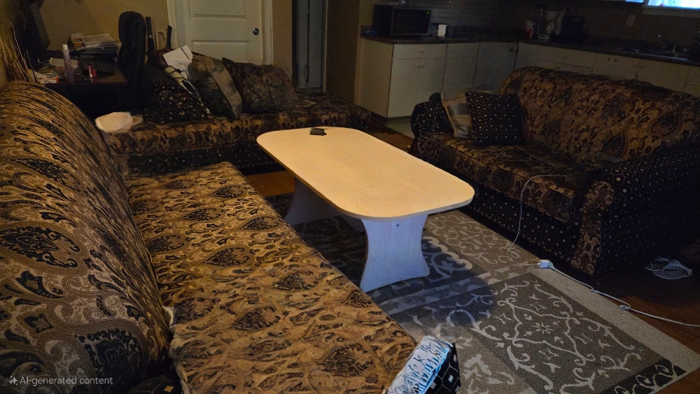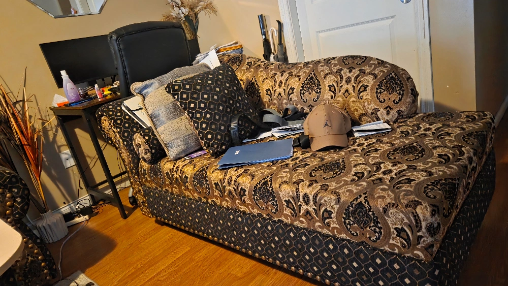 Selling a sofa and loveseat set with a unique patterned design. The set includes decorative pillows as shown in the pictures. Perfect for a living room or den!
