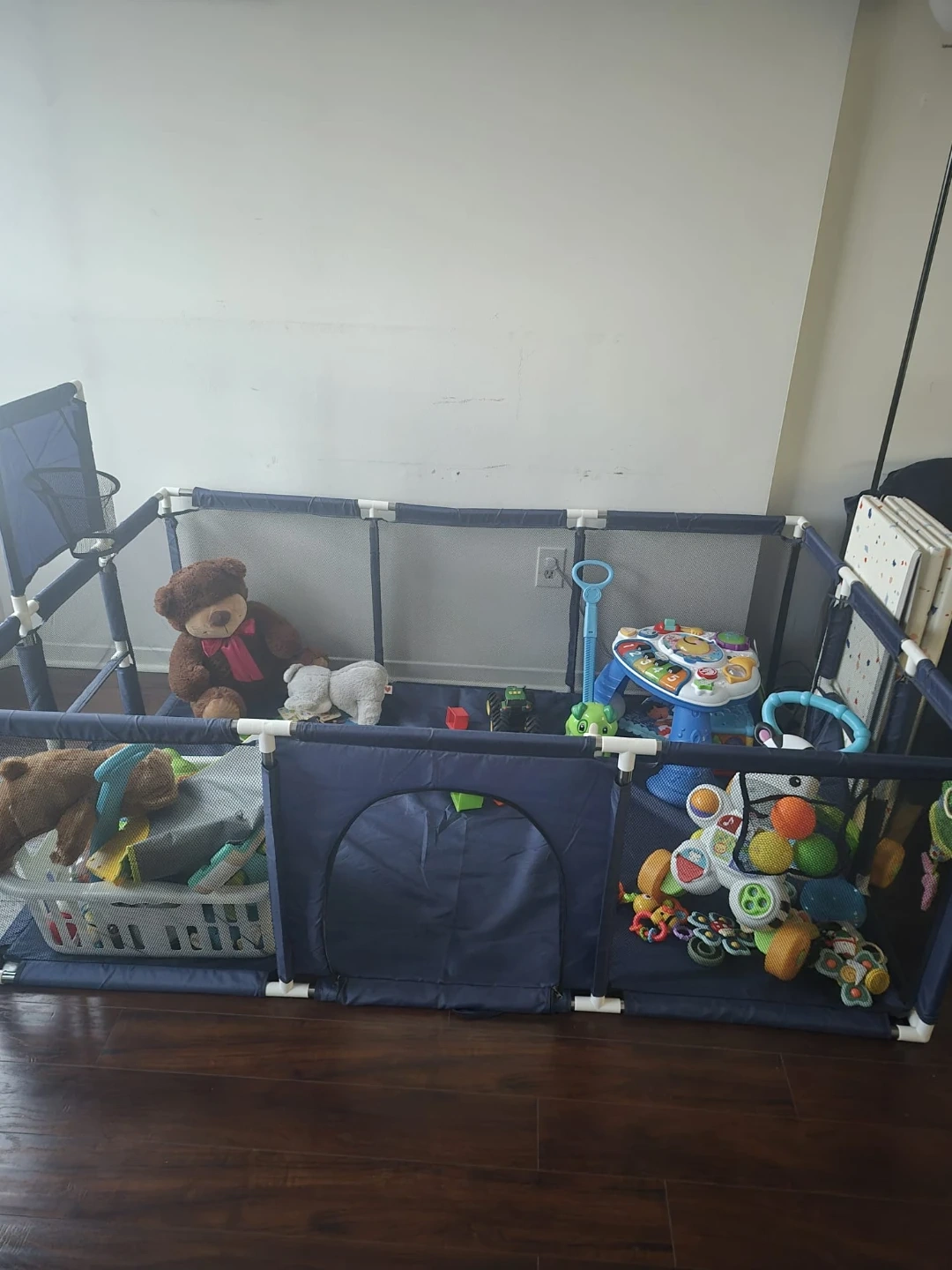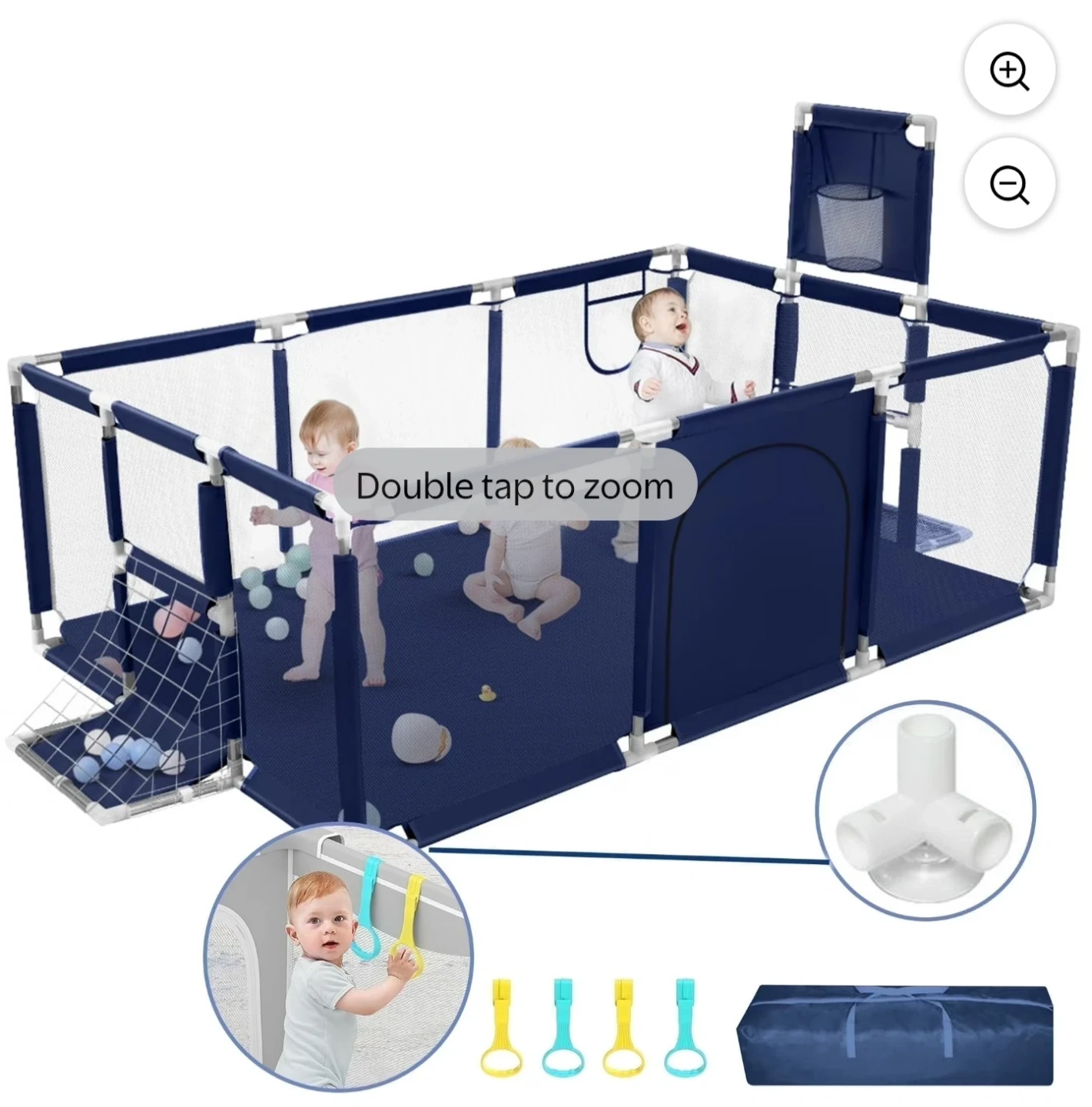 This playpen is made with BPA-free and phthalate-free materials, ensuring it's safe for your little one. It's easy to assemble and comes with various connectors for customization. Includes a football net and hanging rings.