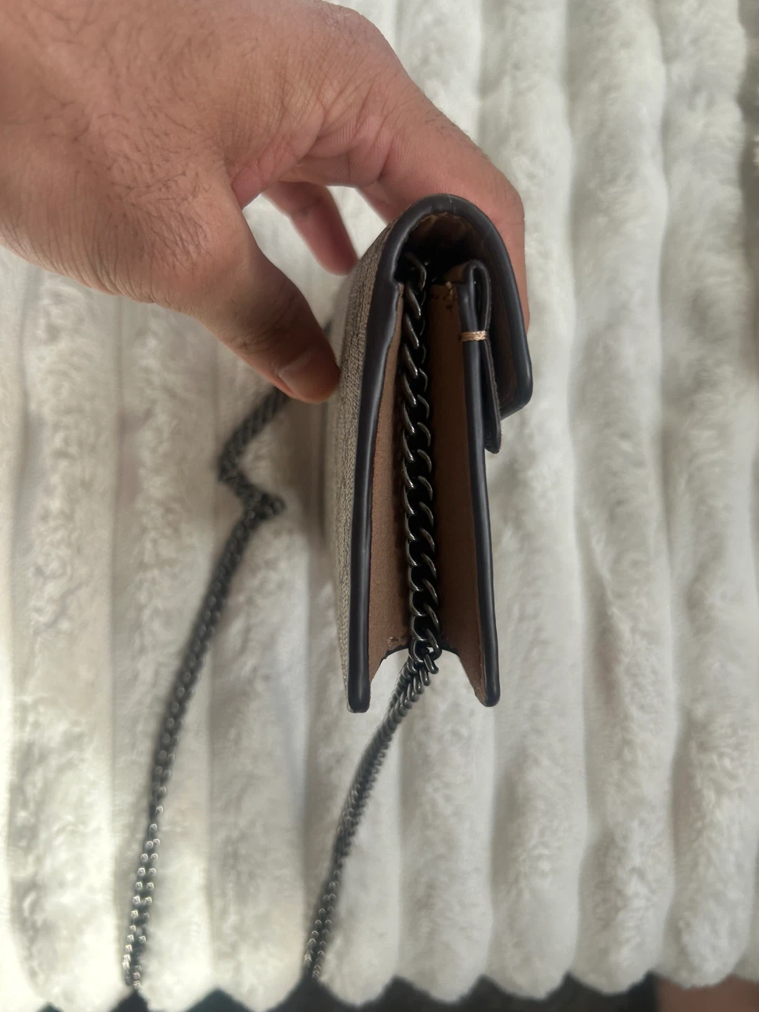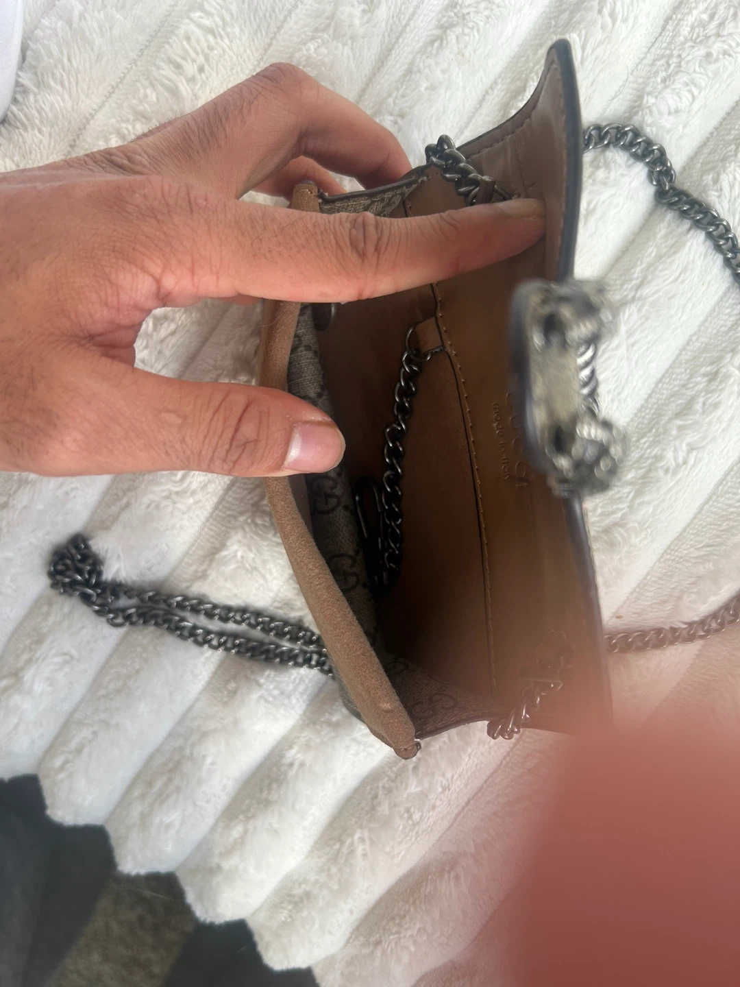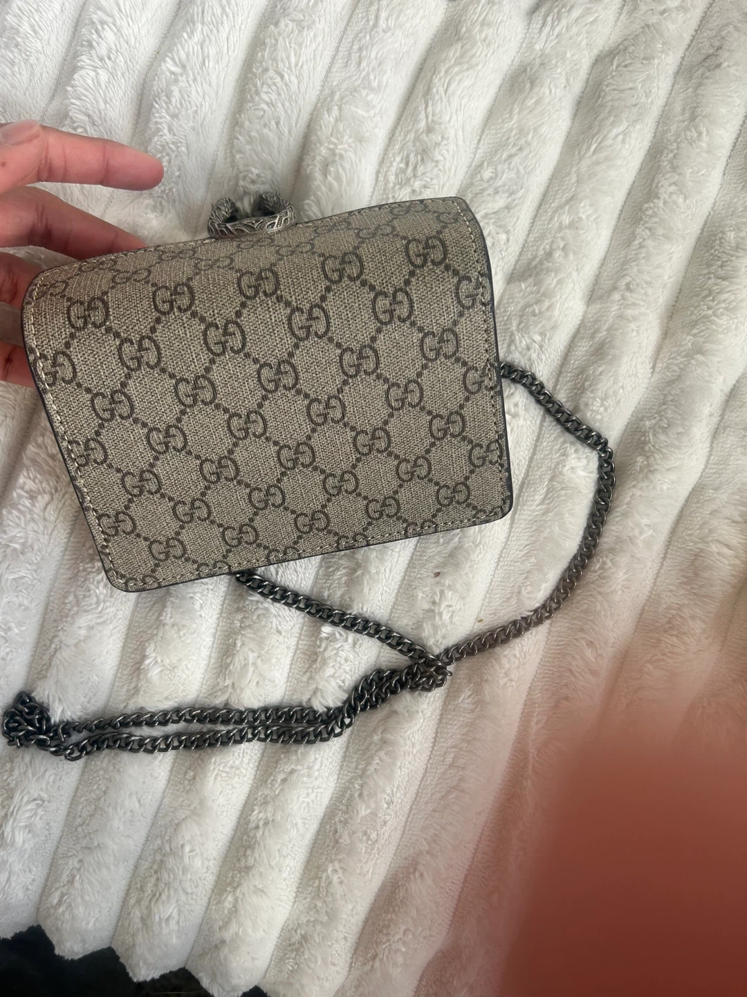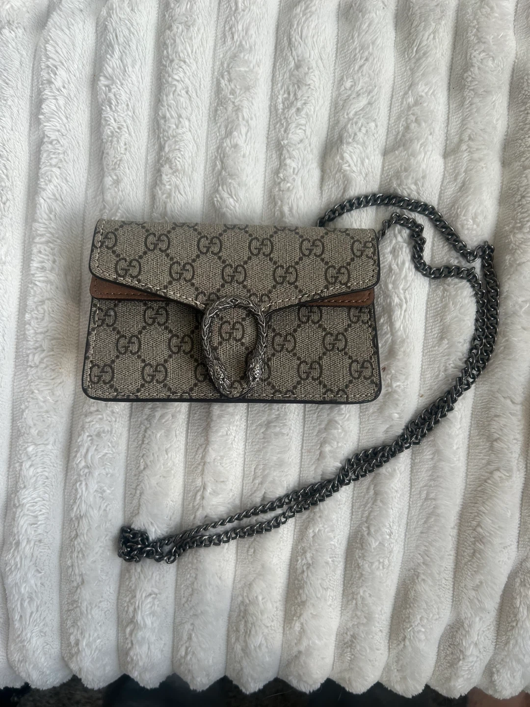 This is a Gucci Dionysus Super Mini Bag in GG Supreme canvas. It features a tiger head spur closure and a chain strap. It's a stylish accessory for your essentials.