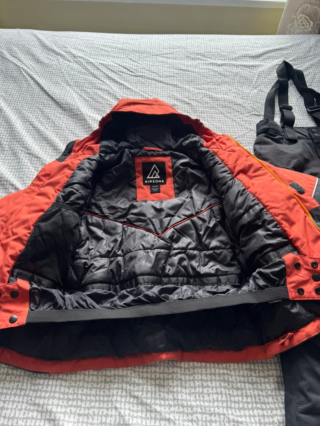 Selling a Ripzone ski jacket and pants set in size XS. The jacket is orange and black and the pants are black. Perfect for hitting the slopes. Great for 6-8 ages . Just worn 5 times