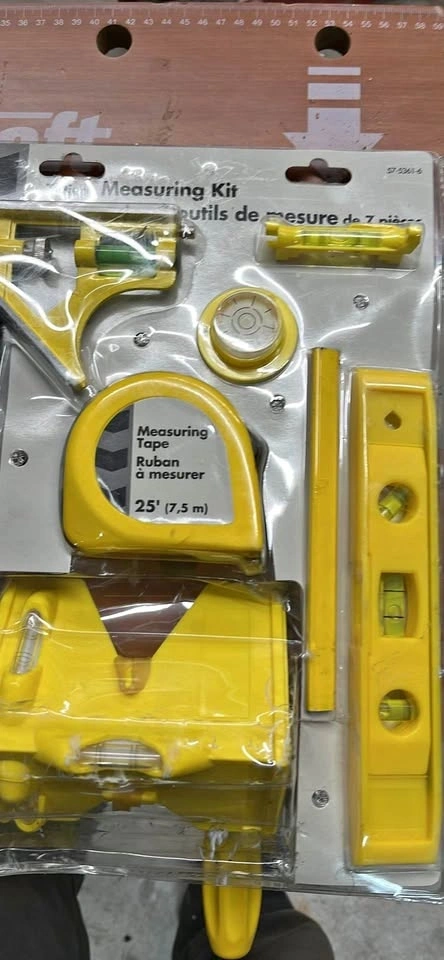 New 7-piece measuring set includes a 25-foot (7.5m) tape measure, torpedo level, line level, and square. Tools are bright yellow plastic for high visibility. Kit is still in original sealed packaging. Feel free to message if you have any questions!