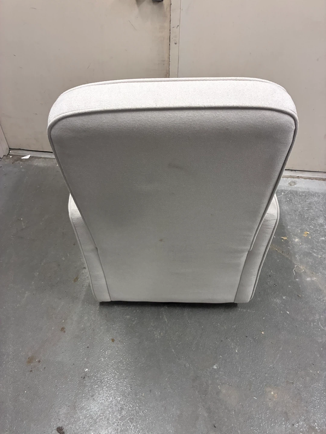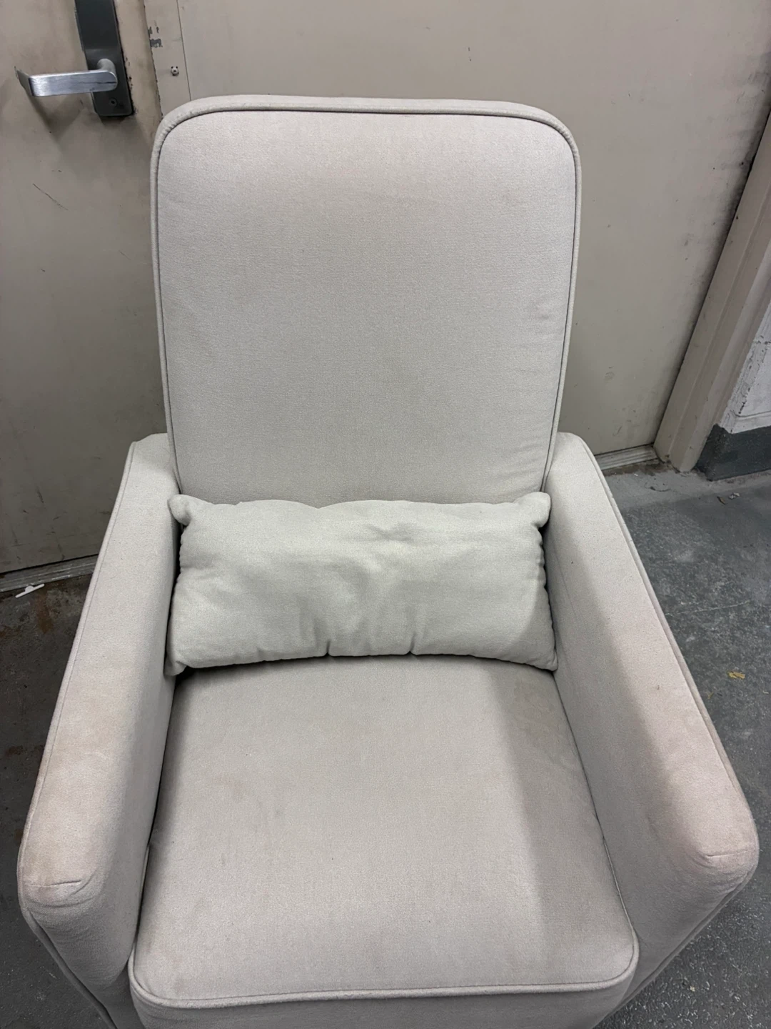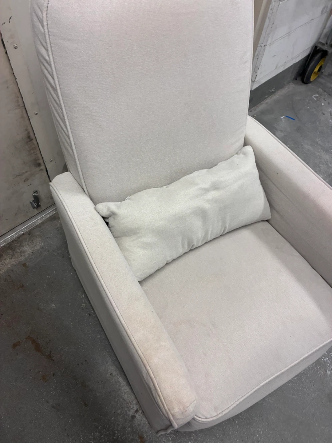 This is a comfortable light grey glider chair. It comes with a matching lumbar pillow for extra support. Upholstered in a soft fabric. Rocking and swevelling .
