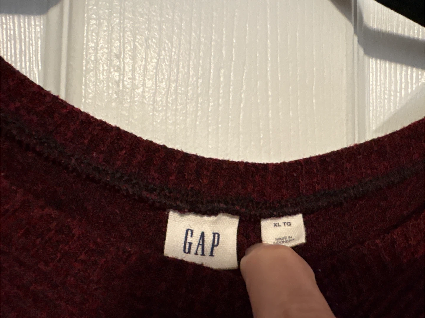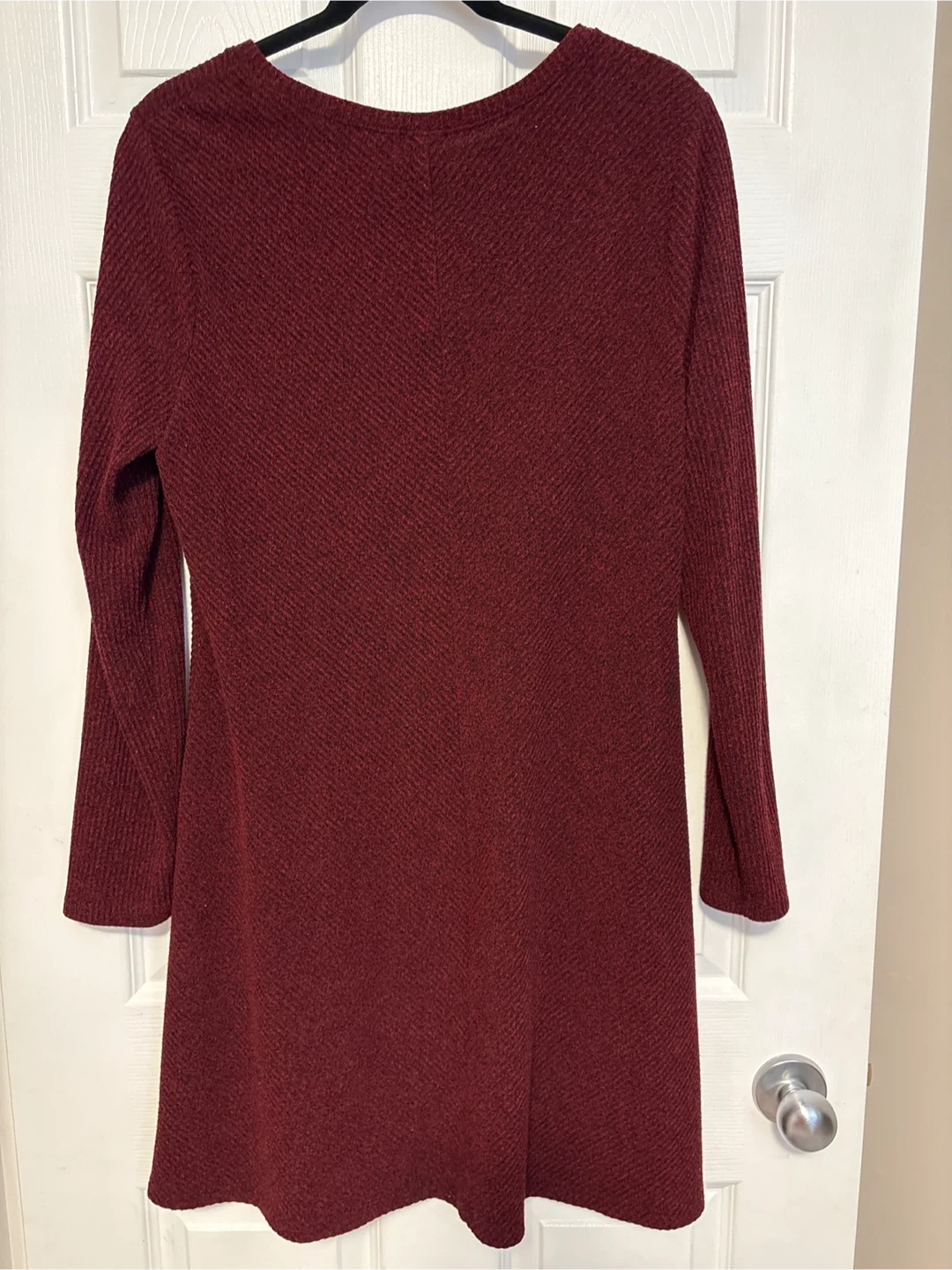 This is a GAP women's long-sleeve tunic dress in burgundy. It's a size XL. The fabric has a textured, ribbed pattern. It's made from a soft material.