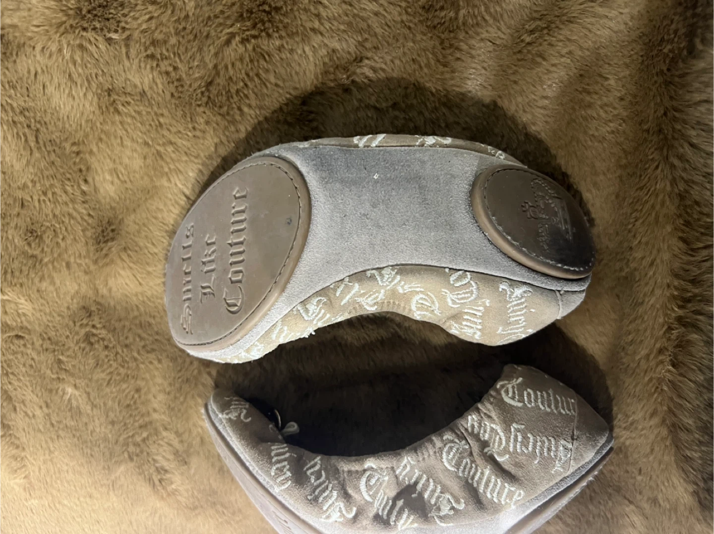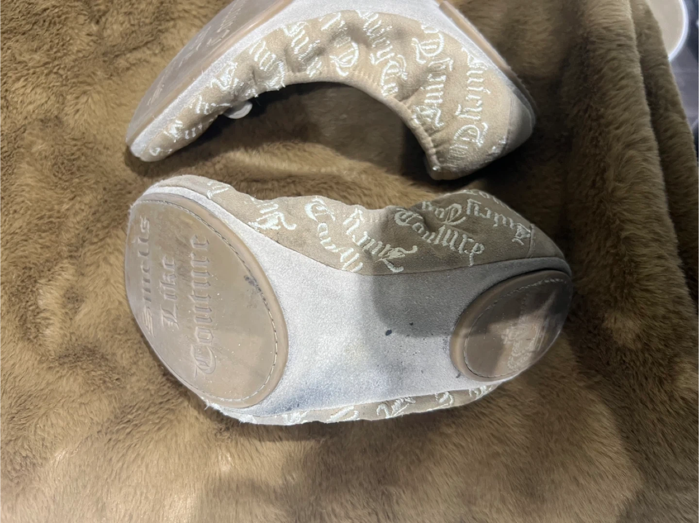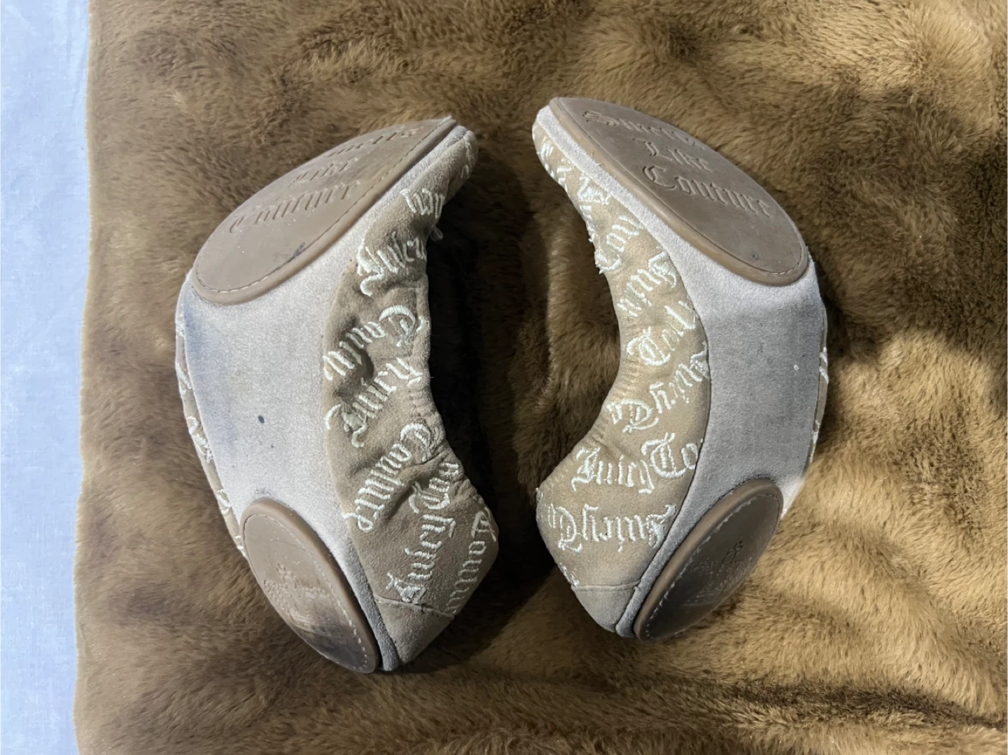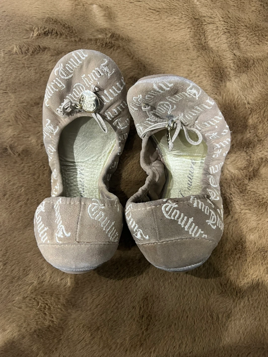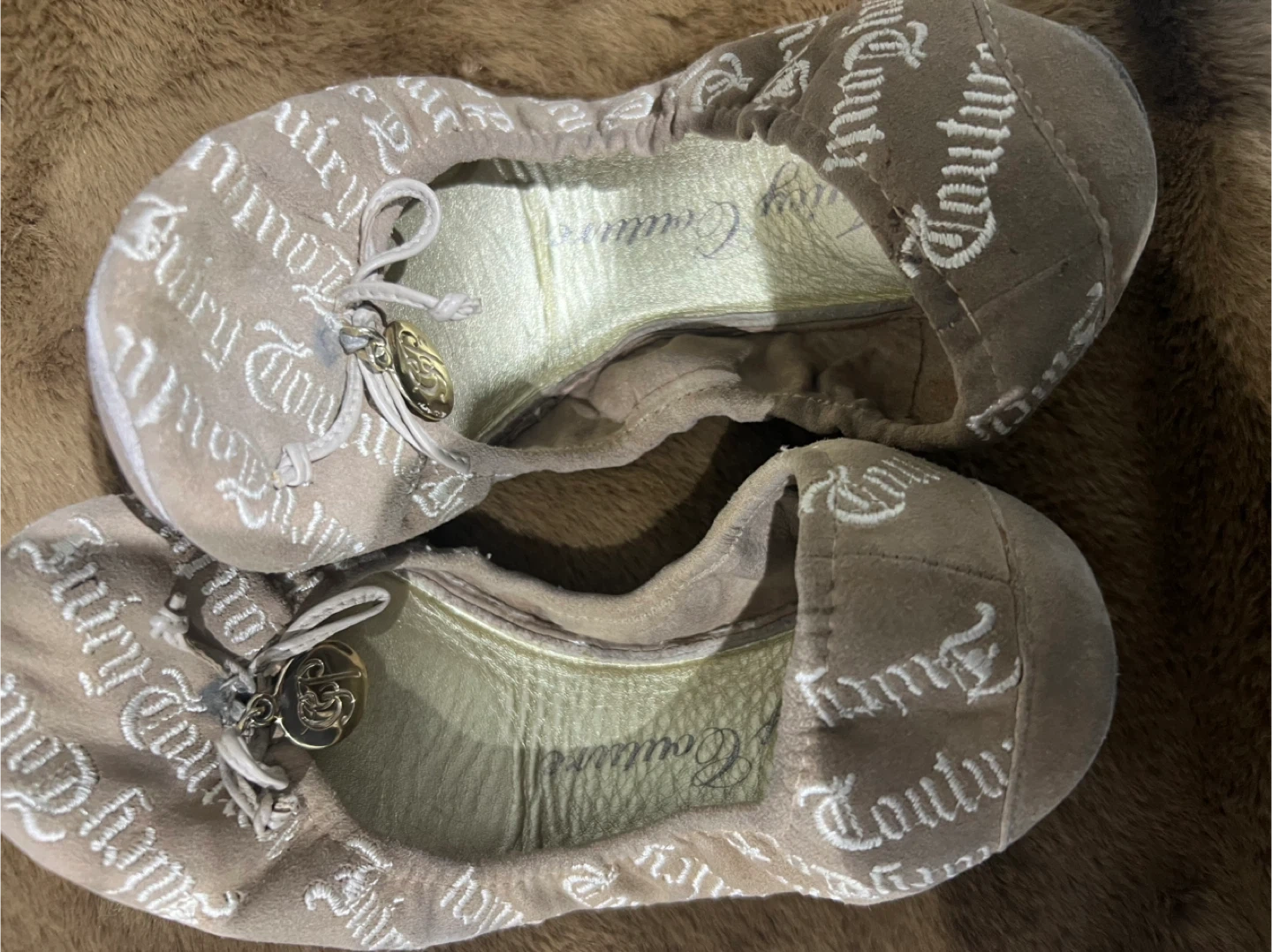 Selling a pair of Juicy Couture ballet flats. They are beige and have the Juicy Couture logo printed all over. They have some wear, but still have lots of life left!
