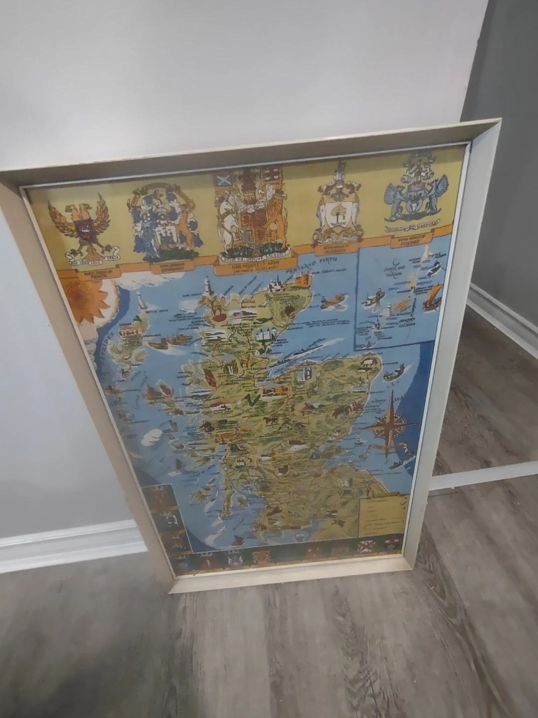 A framed vintage map of Scotland with illustrated details and coats of arms. It's in good condition and ready to hang. This map would be interesting for history buffs or anyone with a connection to Scotland!