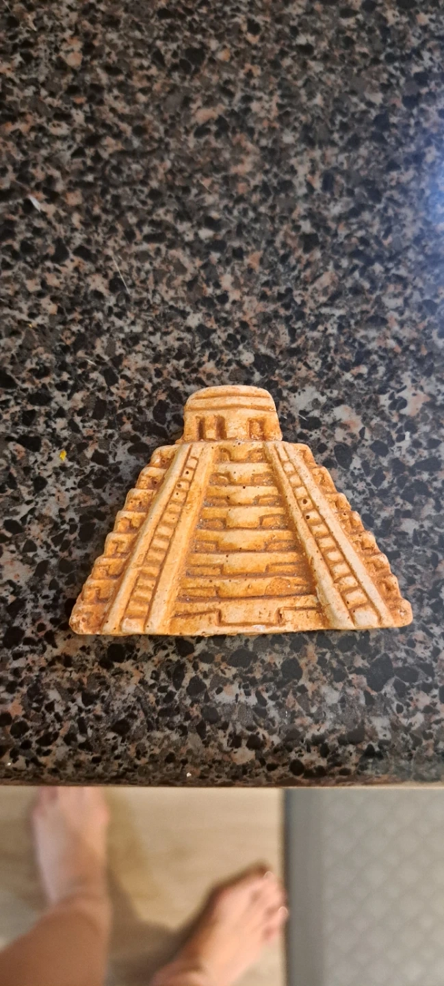 This is a small magnet shaped like a Mayan pyramid. It's made of a durable, ceramic-like material. Perfect for adding a bit of history to your fridge!