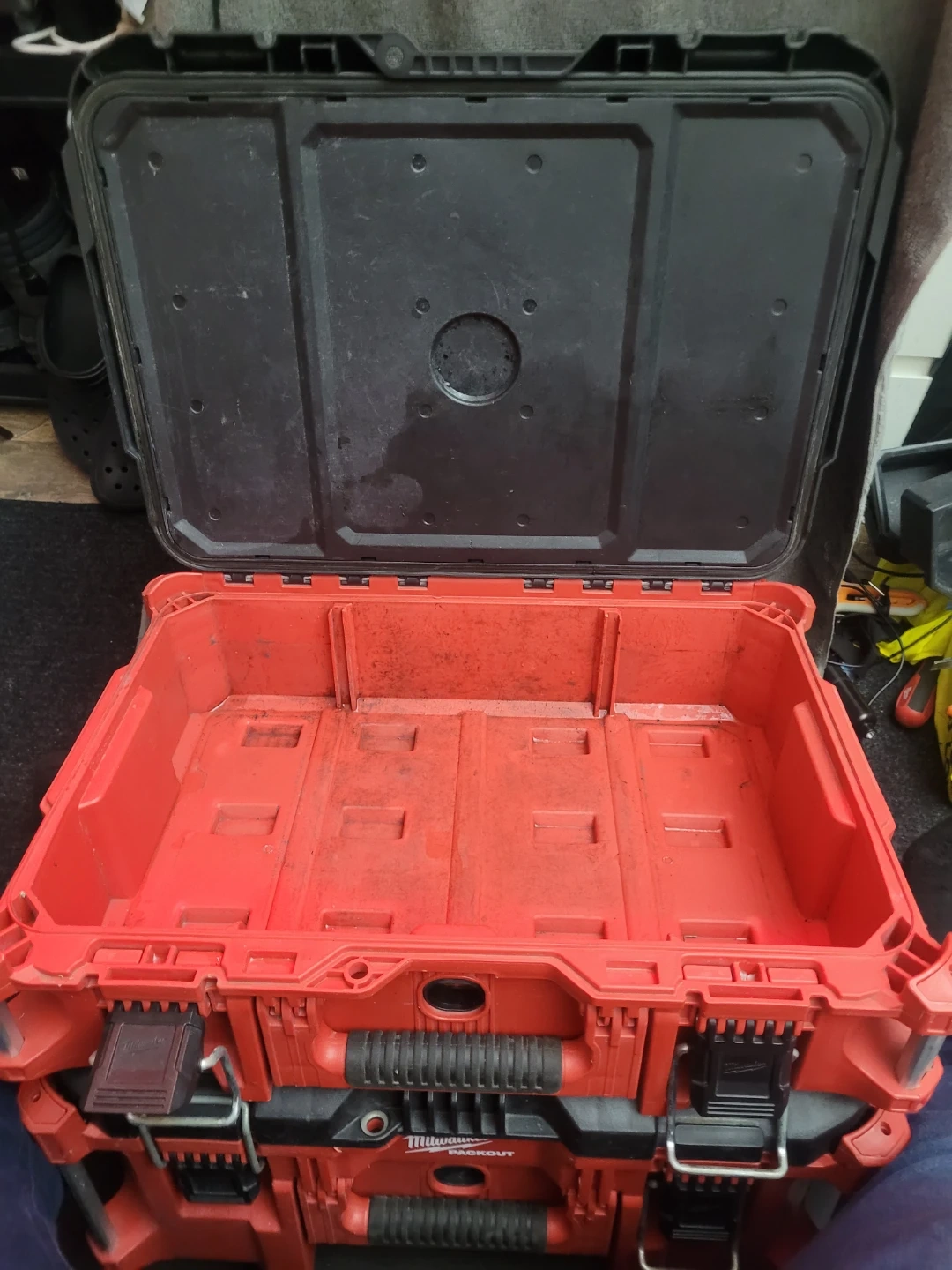 2 units sold together. This is a Milwaukee PACKOUT tool box. It's red and black, made of durable plastic. The lid opens to reveal a spacious interior for storage. It's great for organizing tools and keeping them protected on the job site!