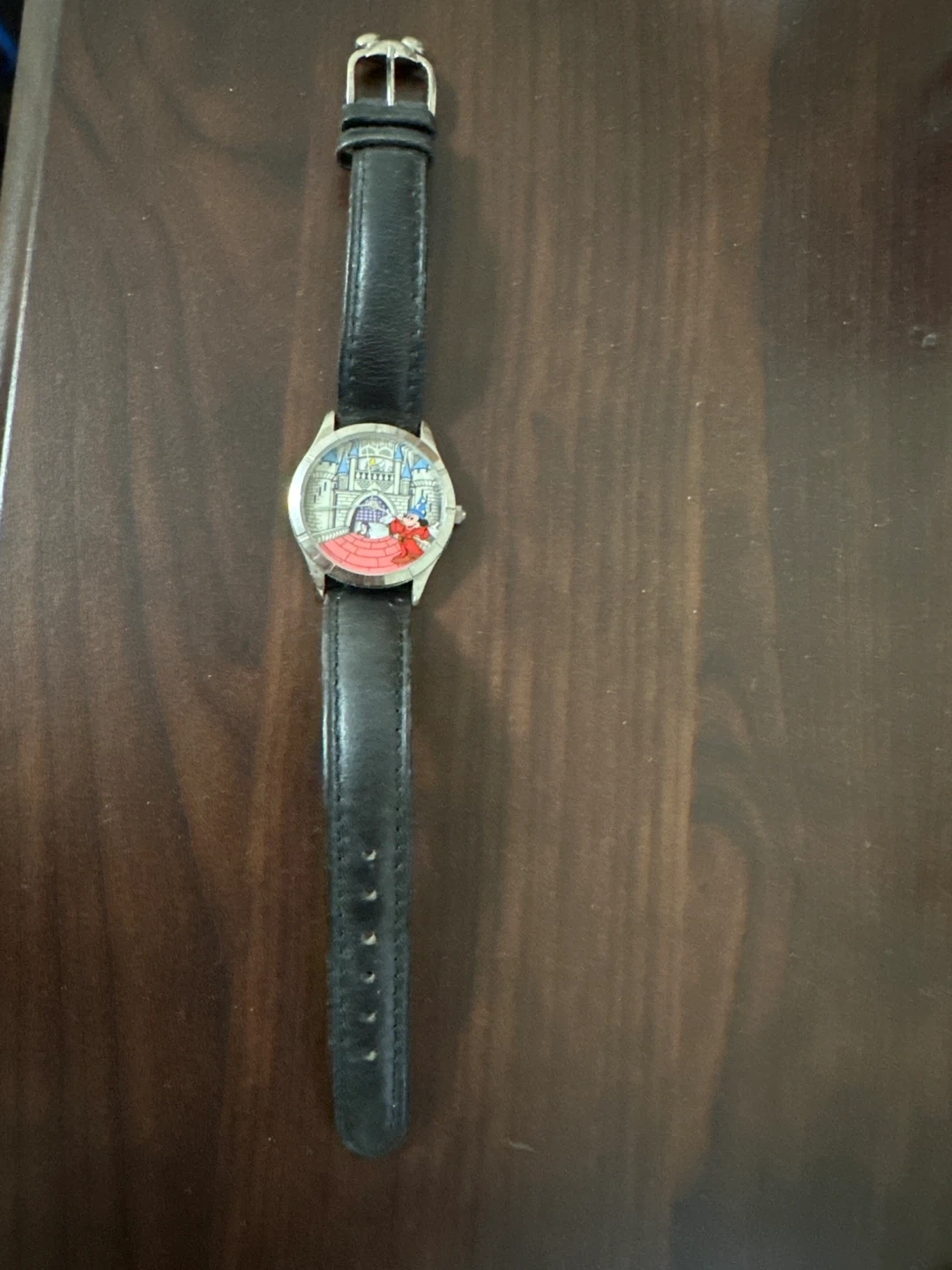 Vintage Disney wristwatch featuring Sleeping Beauty's castle on the dial. It has a classic black leather band. This watch is a fun collectible for any Disney fan!