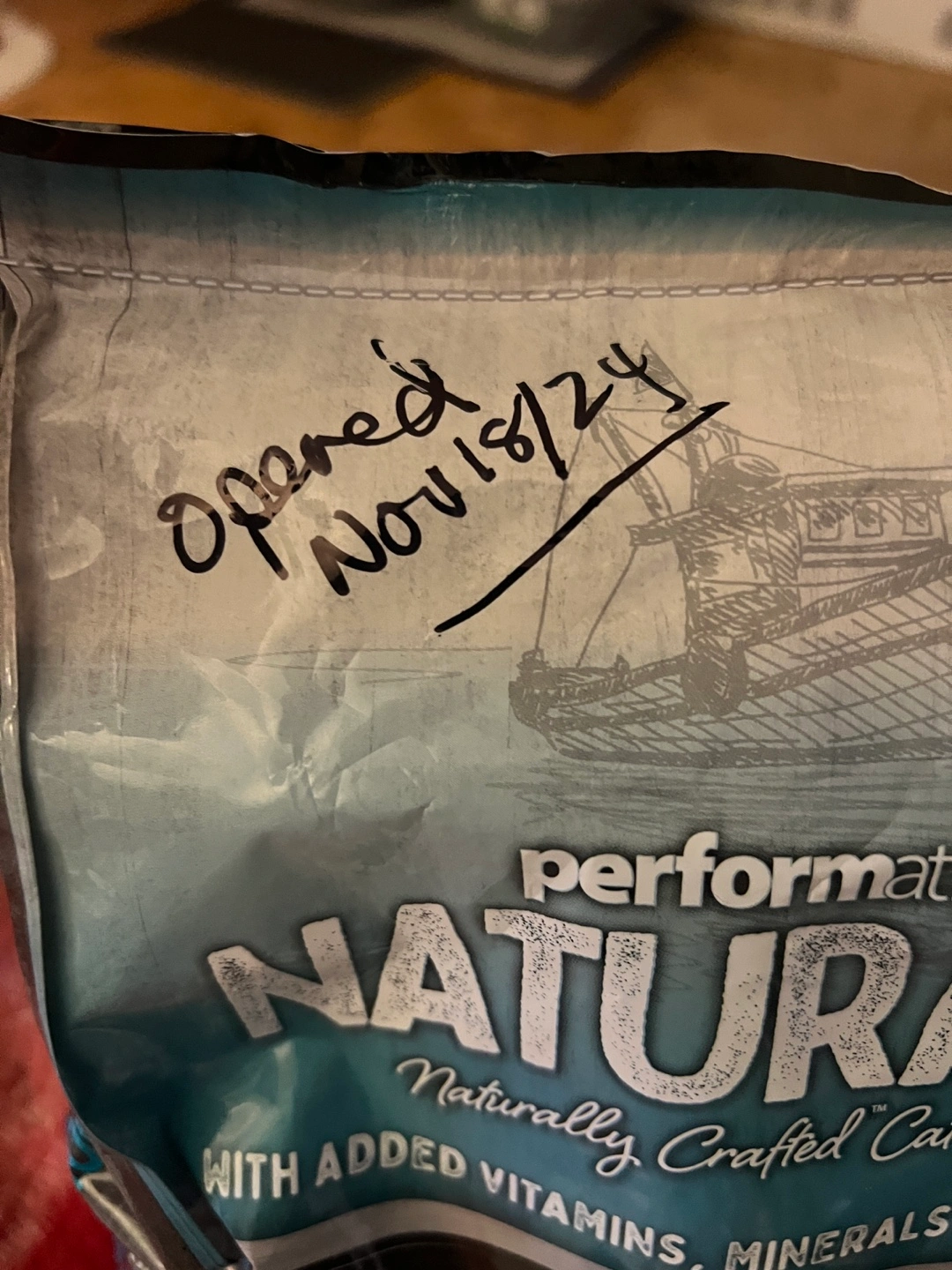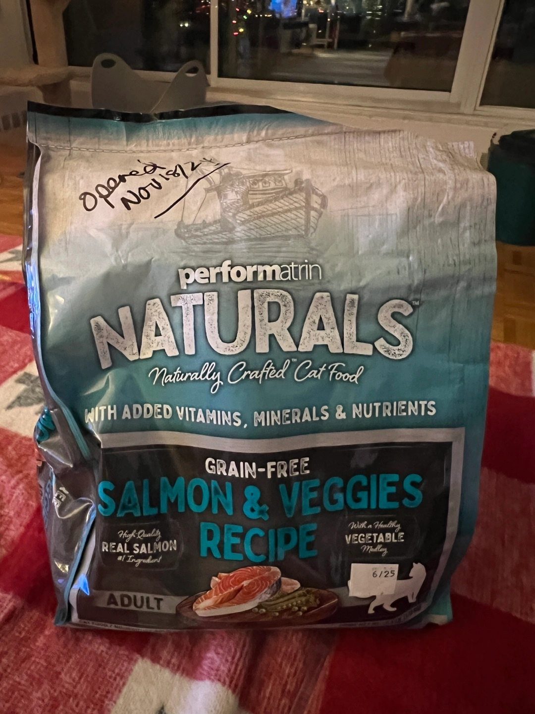 Bag of adult cat food, grain-free salmon and veggies recipe.