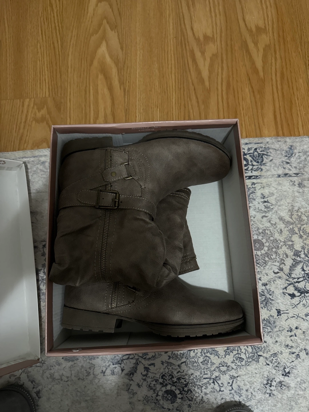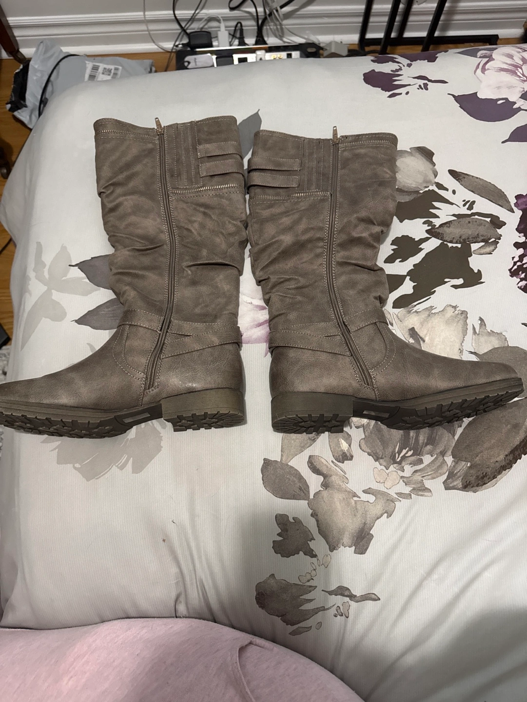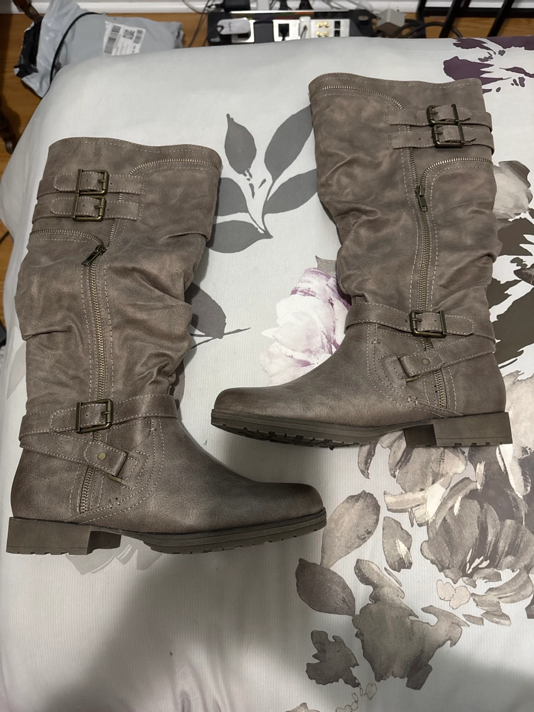 Brown knee high boots with buckle accents. Side zipper. Brand new in original box. Colour tan