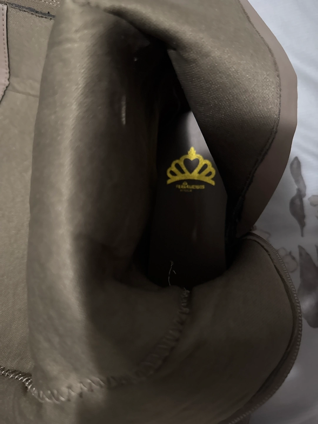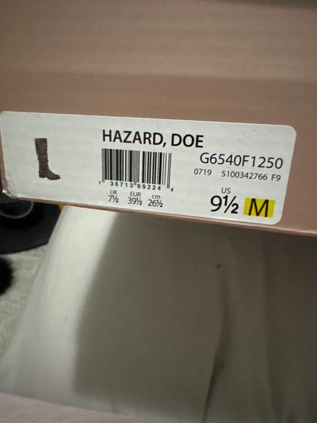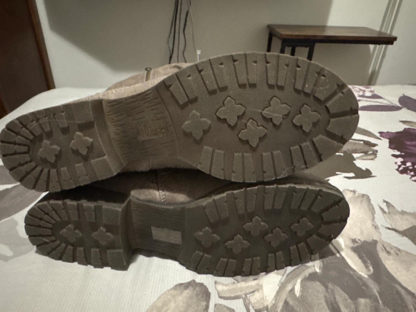 Brown knee high boots with buckle accents. Side zipper. Brand new in original box. Colour tan
