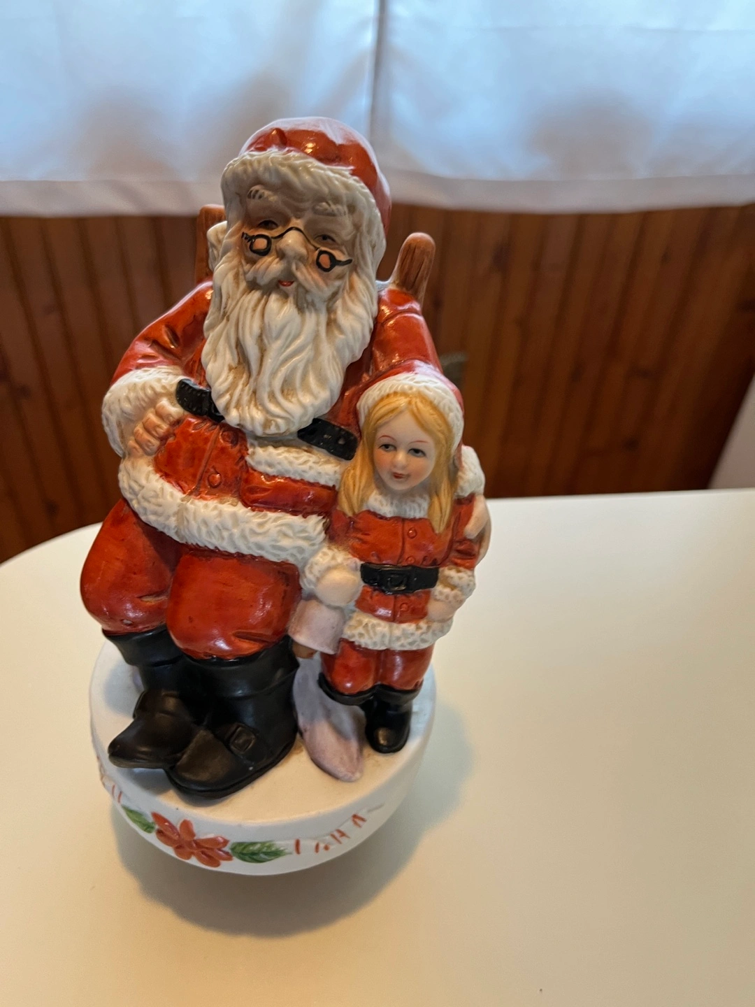 Porcelain figurine of Santa Claus sitting in a chair holding a little girl. The figurine plays the song “Santa Claus is Coming to Town” when wound up and slowly spins around