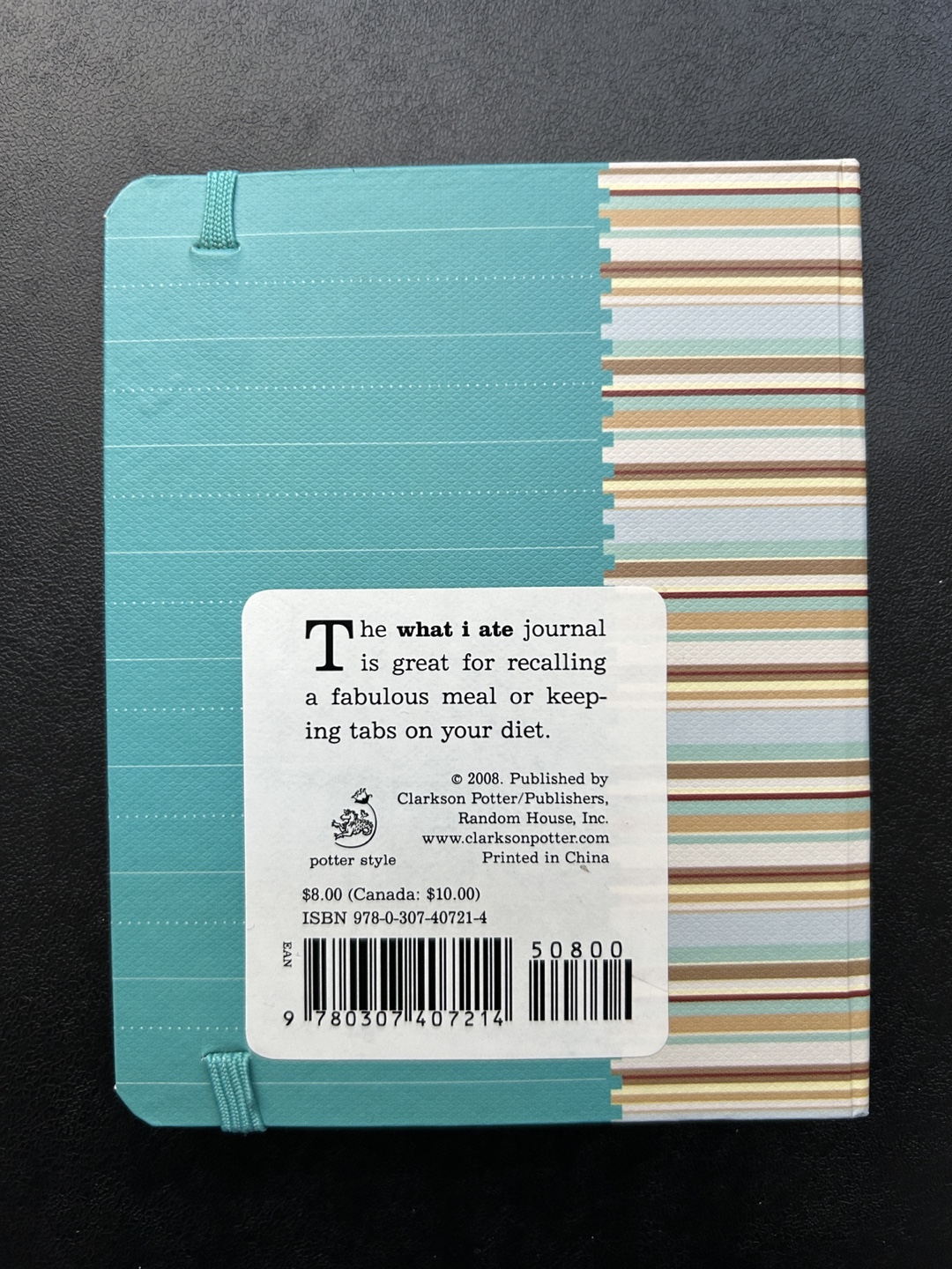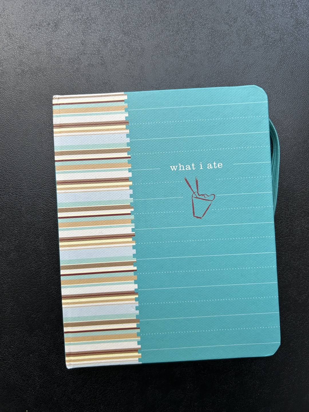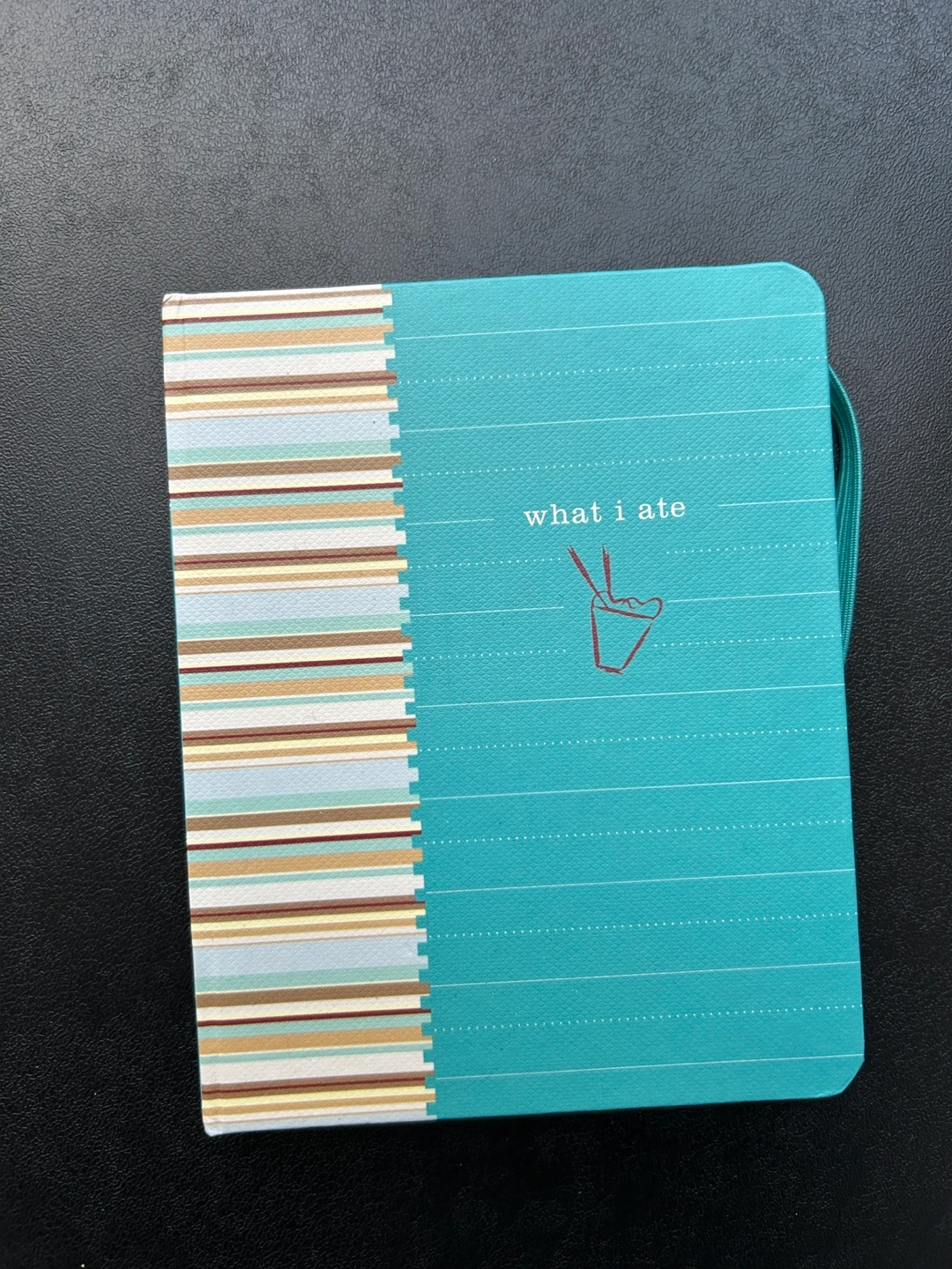 Small, blue and white striped journal with a food-themed cover.