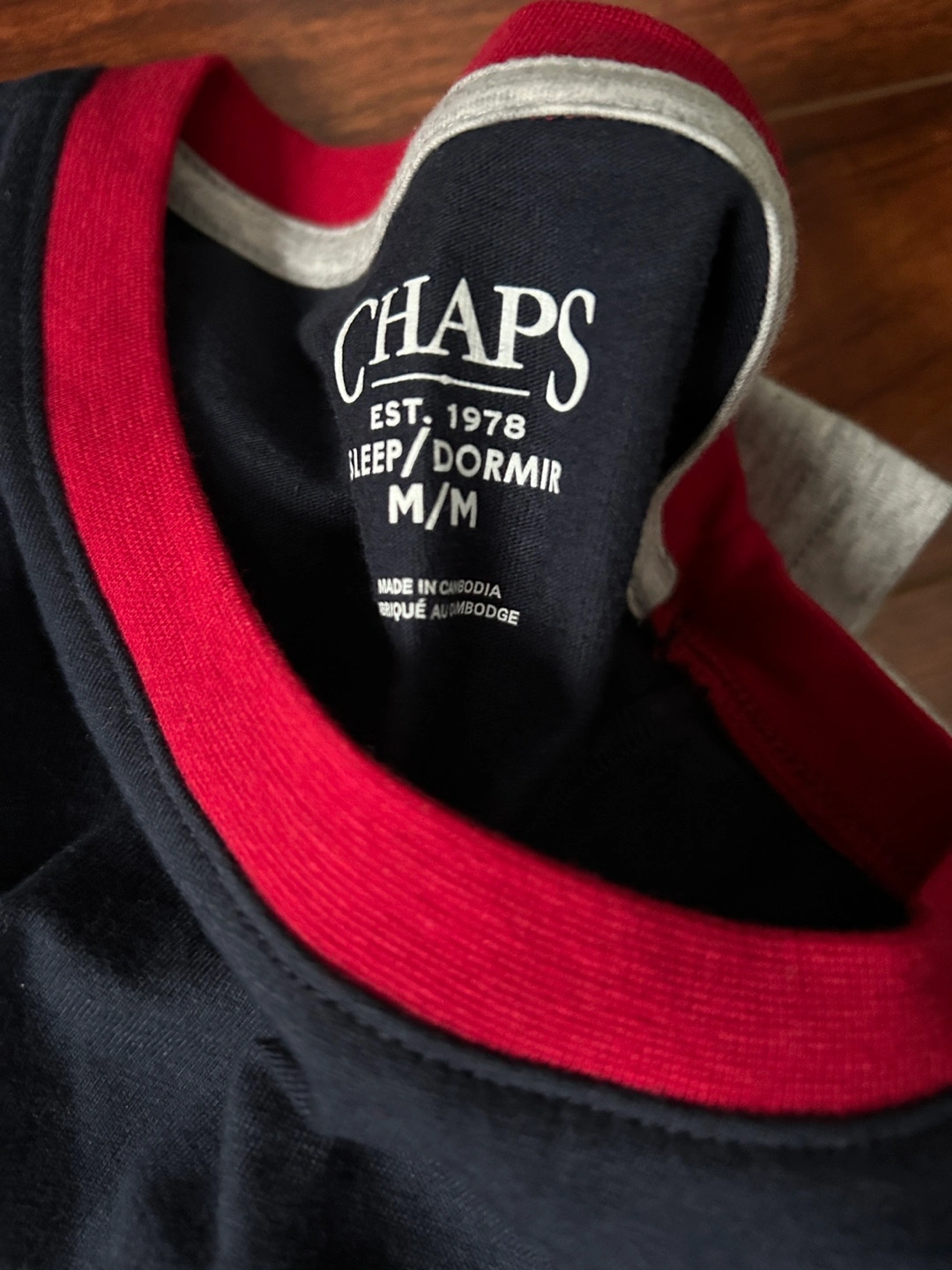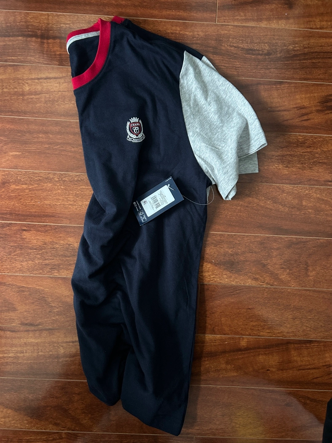 Navy blue and grey t-shirt with red trim. Has a small embroidered logo on the front.