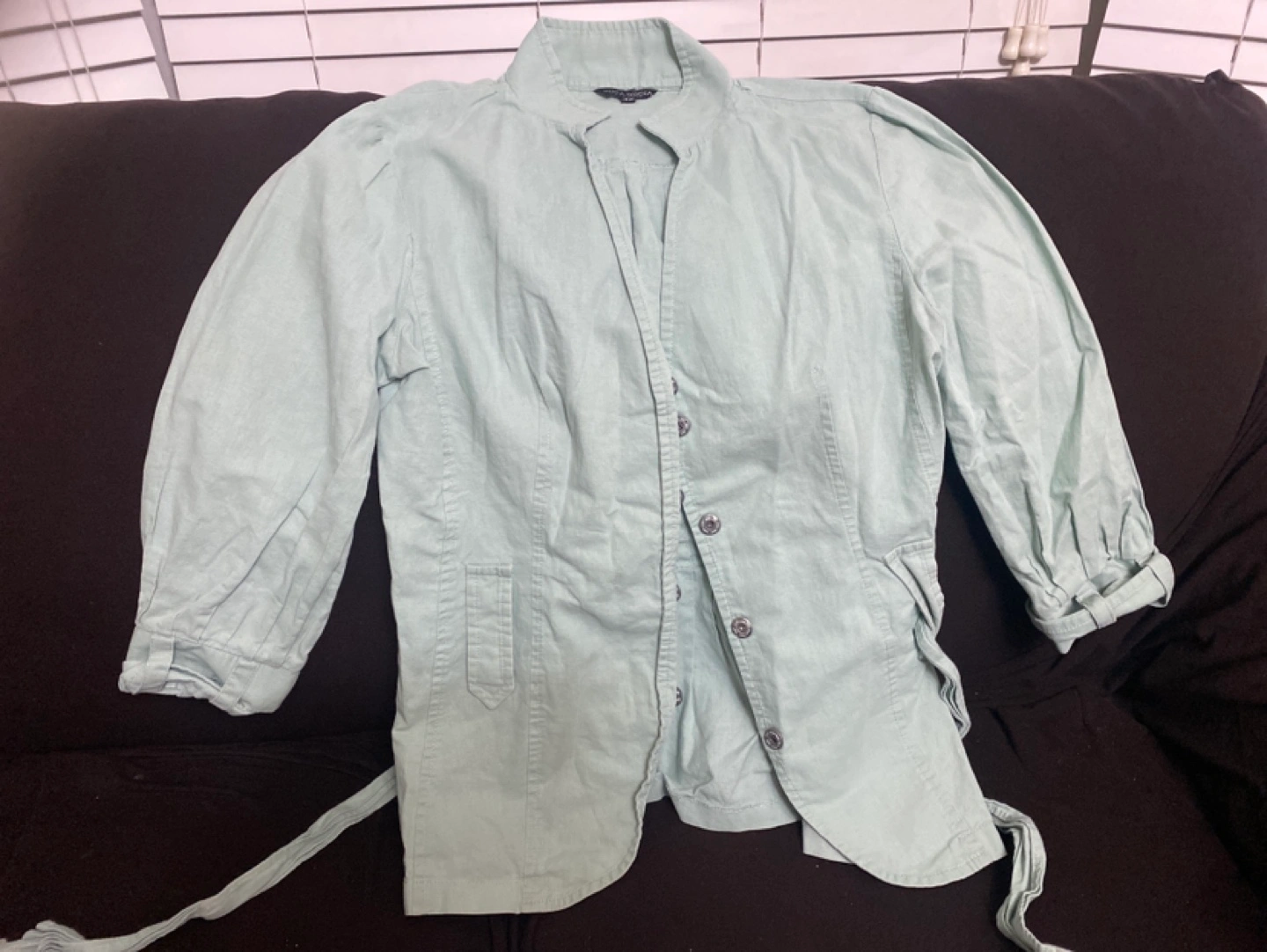 Light green button-up blouse. Features a tie at the waist and 3/4 sleeves.