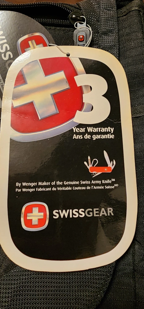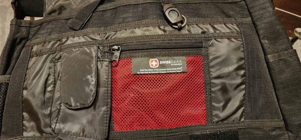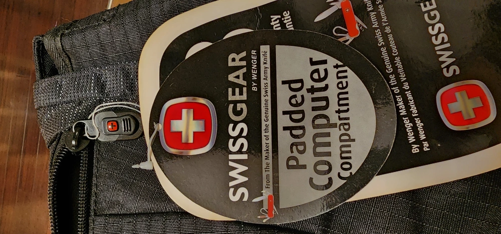 Padded laptop compartment to protect your laptop, lots of pockets, and a SwissGear logo.