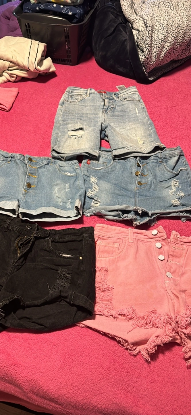 3 pairs of shorts. Two are black and one is a light denim. One pair of black shorts has a zipper and black fabric belt.