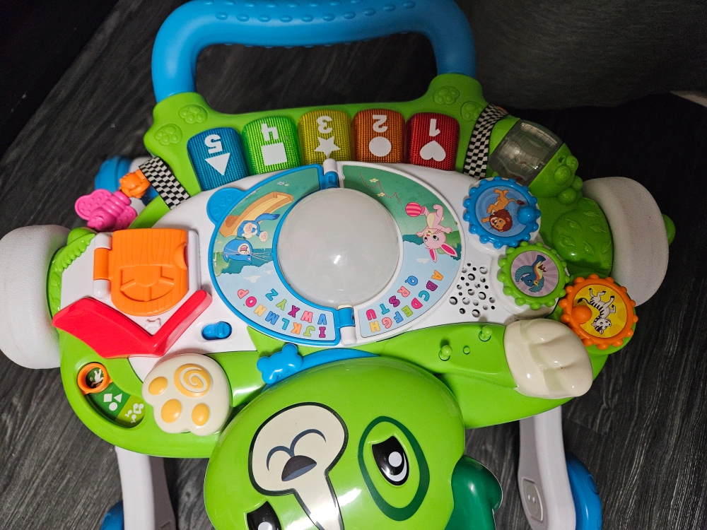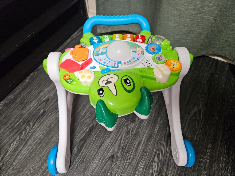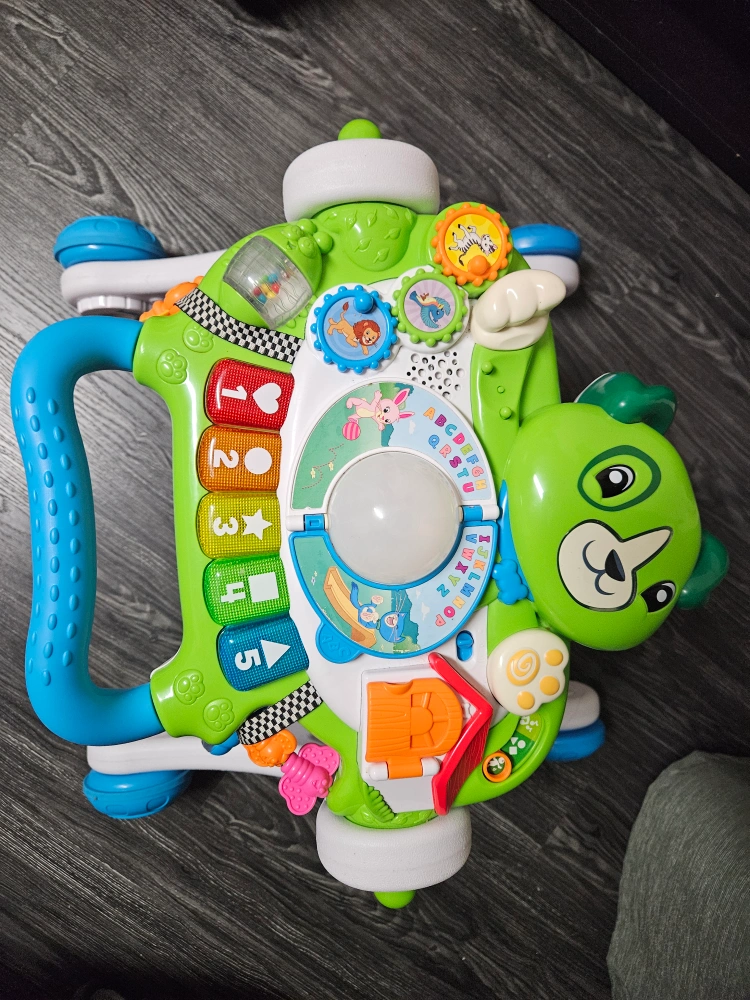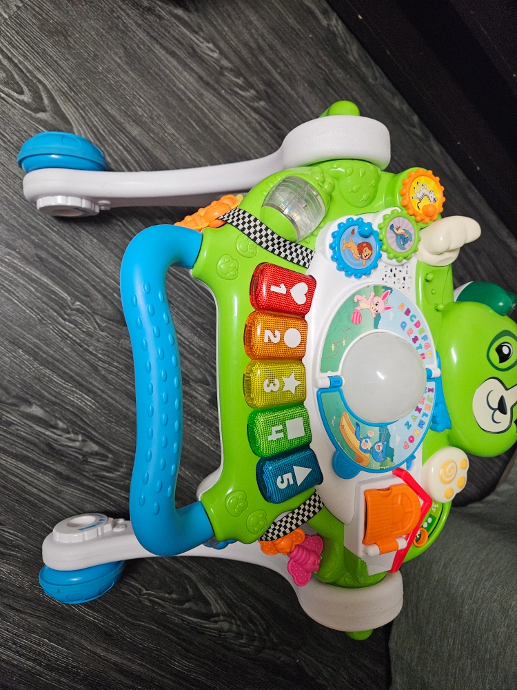 159Green and blue walker with a light-up panel, musical buttons, and spinning toys.