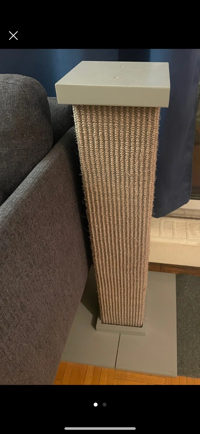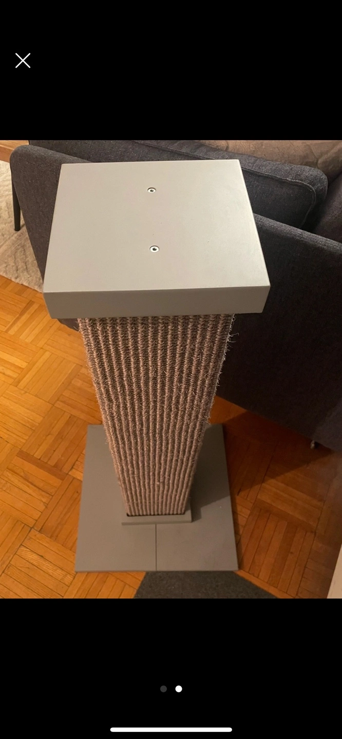 Grey cat scratching post with a square base and a square platform on top. Covered in sisal rope. Sturdy and helps protect furniture.