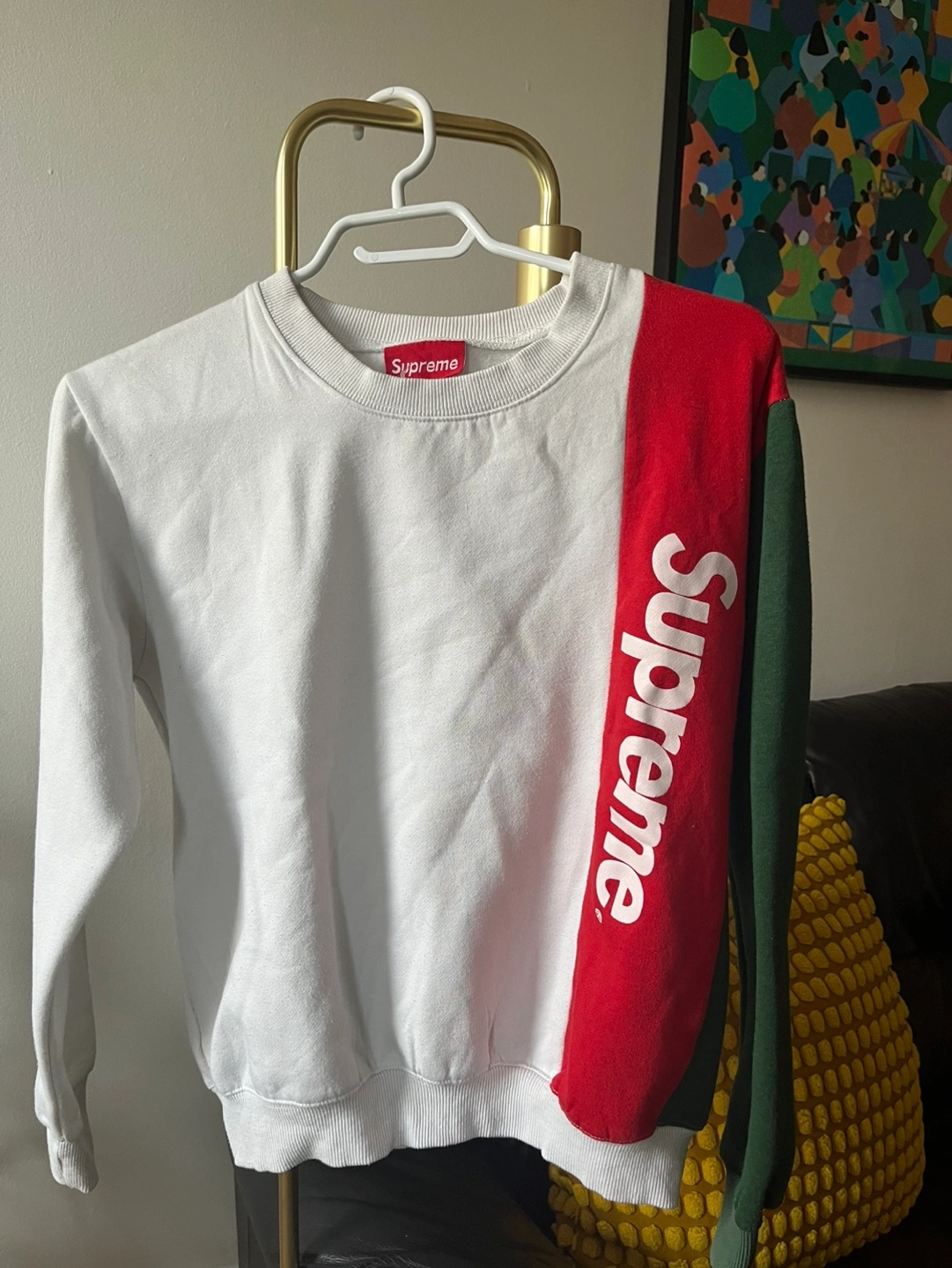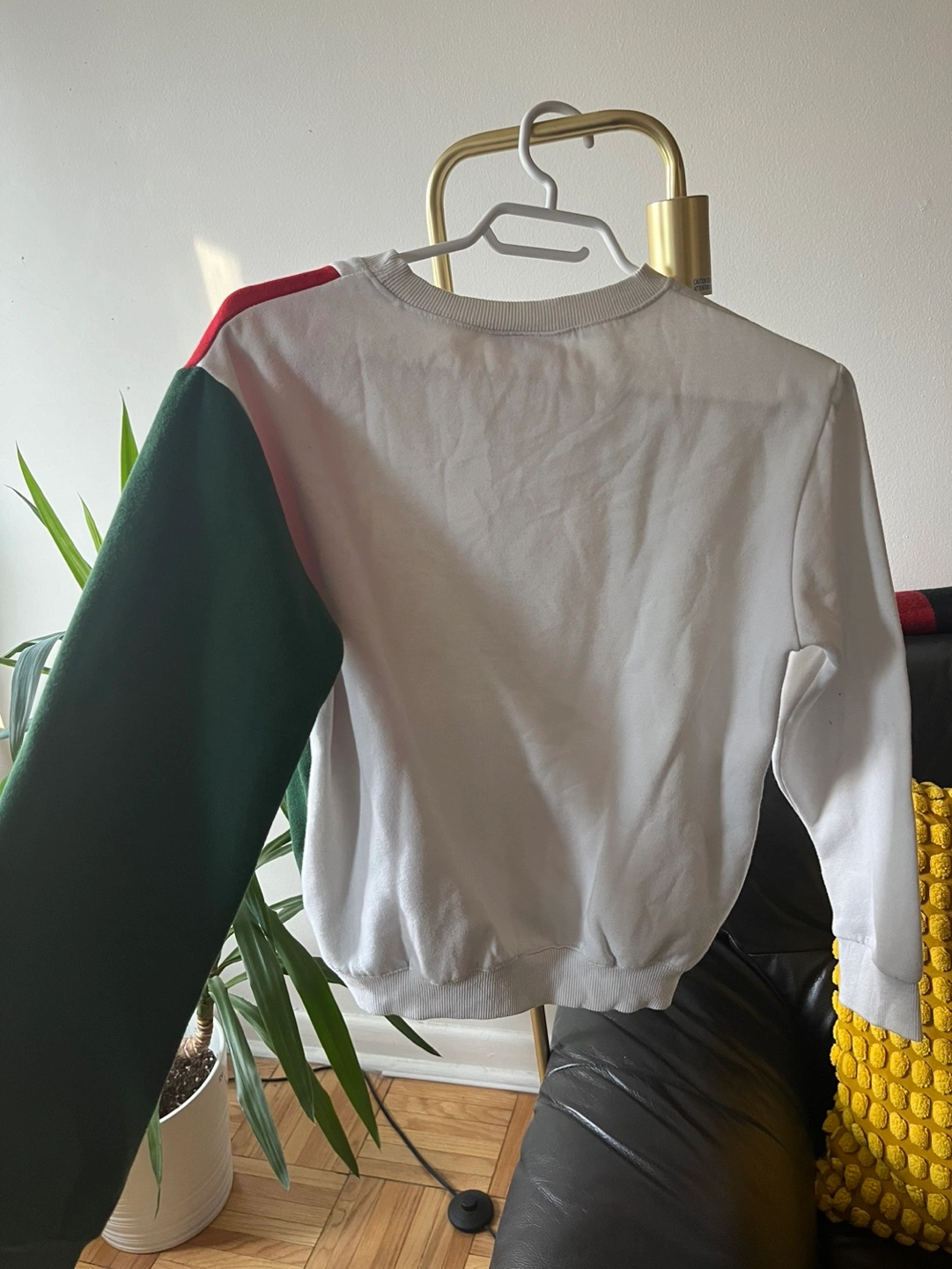 379Small size. White with red, green, and white colour blocking. Long sleeves. Authentic! In used condition with no flaws Even though its size small it would be better for someone extra small
