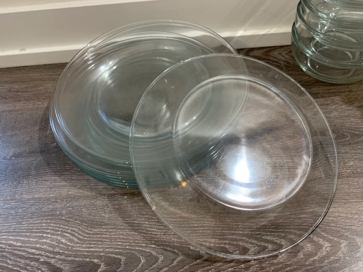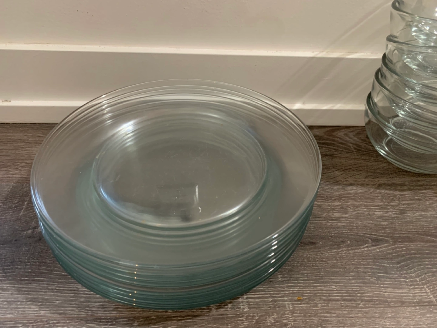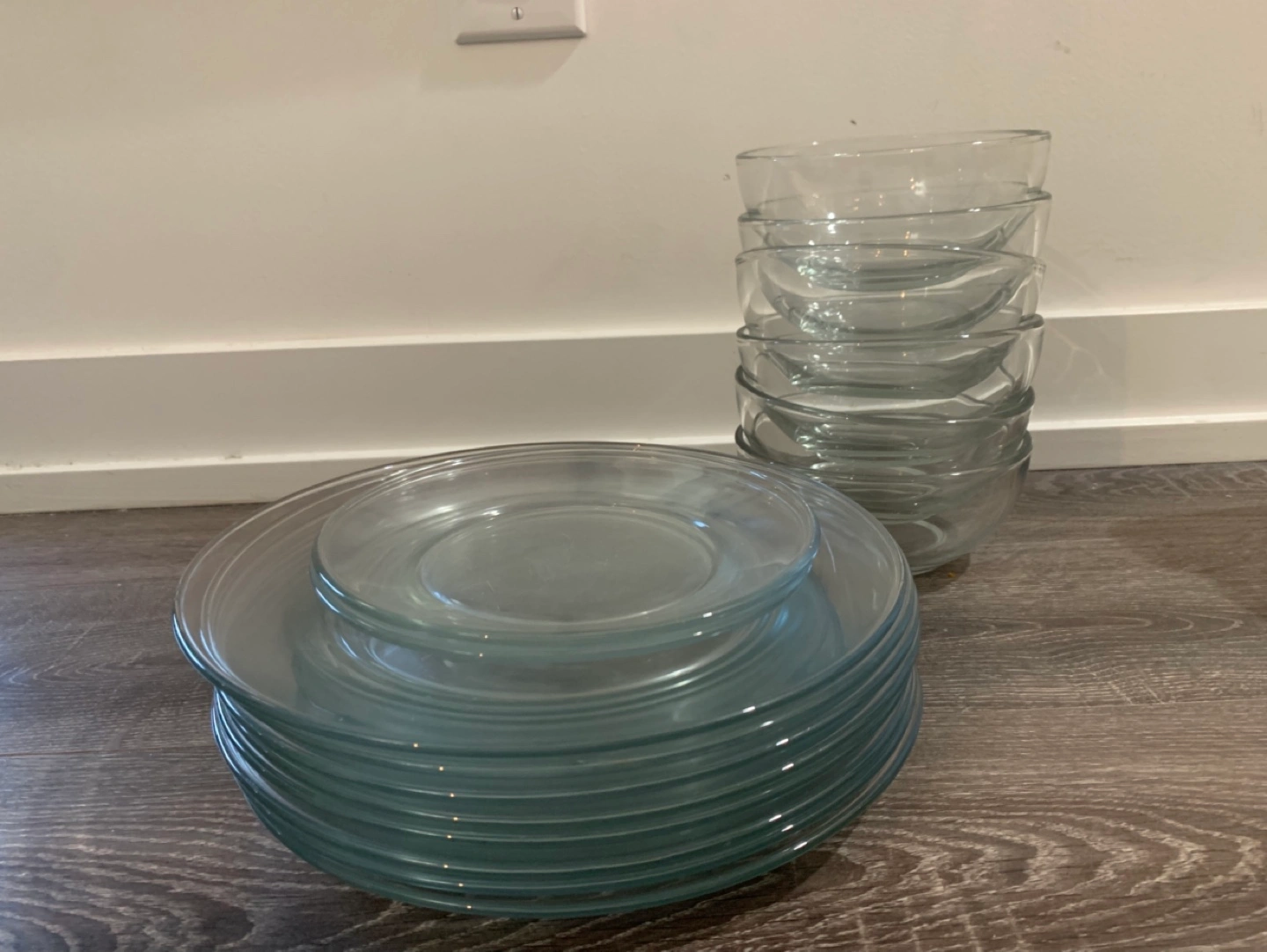 Set of 10 clear glass plates and 6 clear glass bowls. Good condition.