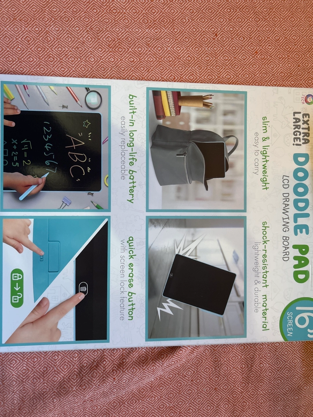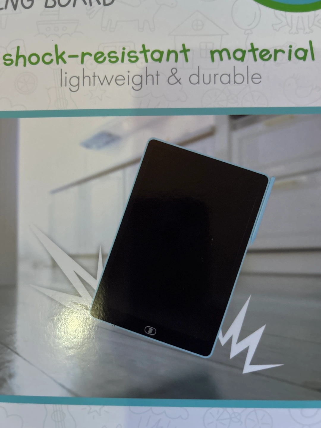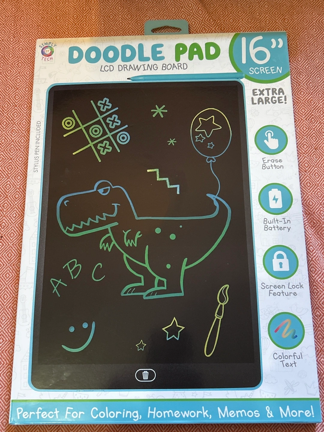Extra large LCD drawing board. Includes stylus pen. Shock-resistant material. Built-in battery. Screen lock feature. Perfect for coloring, homework, memos, and more.